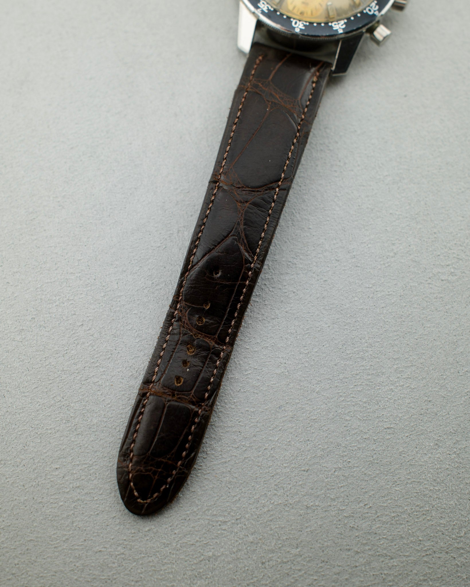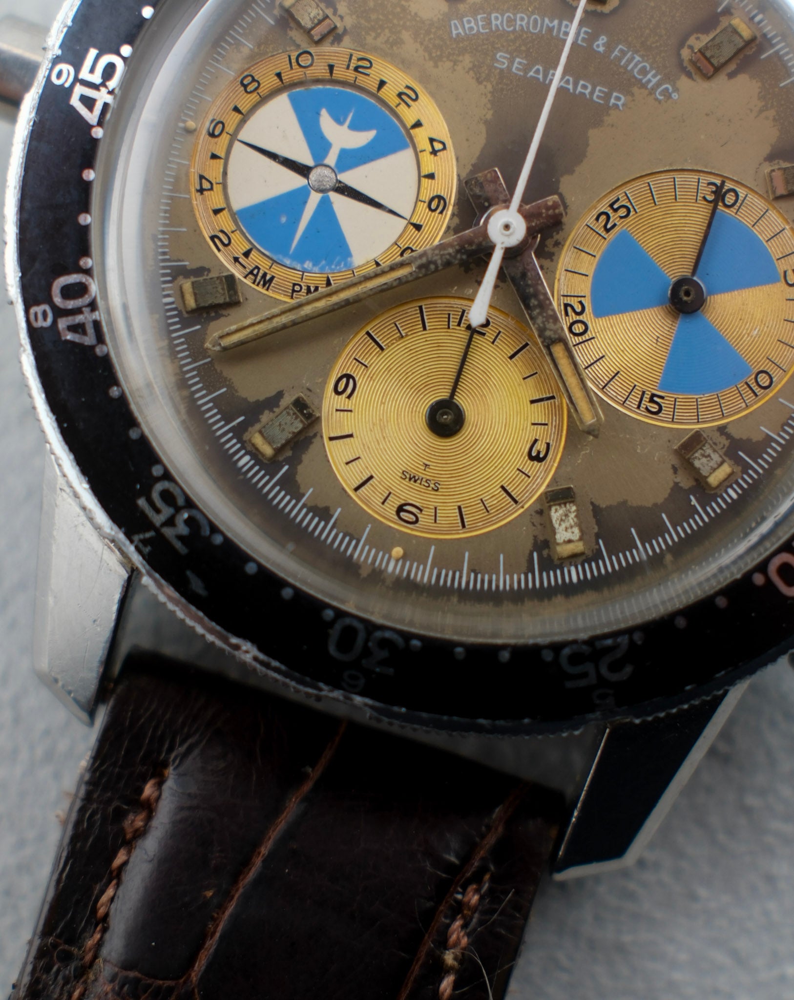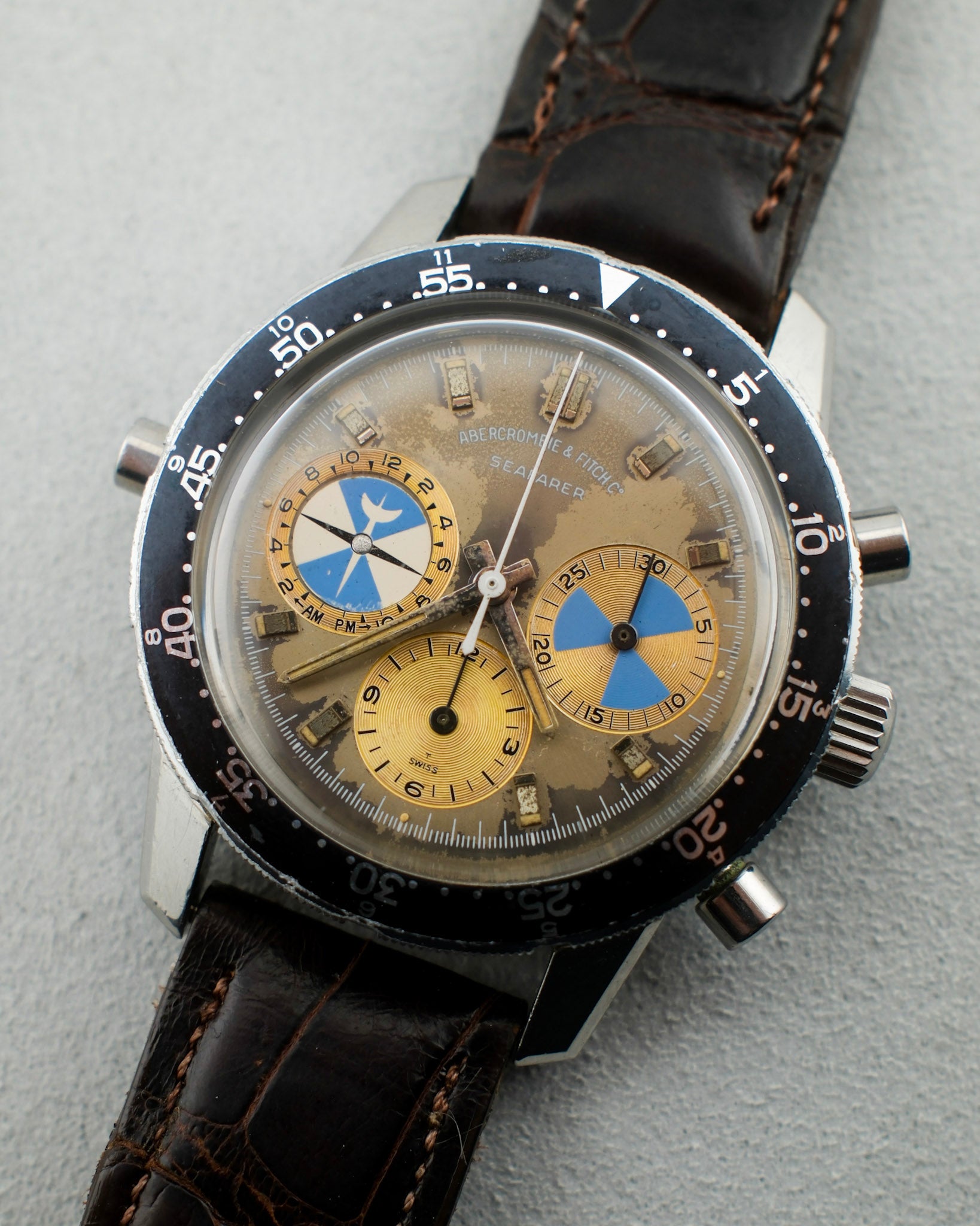 This Abercrombie & Fitch Co. / Heuer features a 40mm unpolished stainless steel case that sits in overall good condition for its age. It shows light scratches throughout and a few small dings to its lugs. Its case back shows light scratches, most notably to what would be its 12 o'clock area. Its bezel shows light wear to its surface and some smaller dings to its steel edge. its dial shows an eye-catching patina with its grey surface having turned to a champagne color in areas. Its sub-registers have turned to a brighter gold/champagne color as well with some small marks visible in areas. It sports applied hour markers, steel stick hands, and a white central chronograph seconds hand. Its chronograph functions and resets properly and showcases good tidal function. This piece is powered by a cal. 721 movement and is fitted with a dark brown genuine crocodile leather strap and steel buckle. Its crystal sits in good condition. Overall, this Seafarer sits in great vintage condition, showing an incredible patina and wear consistent with its age.