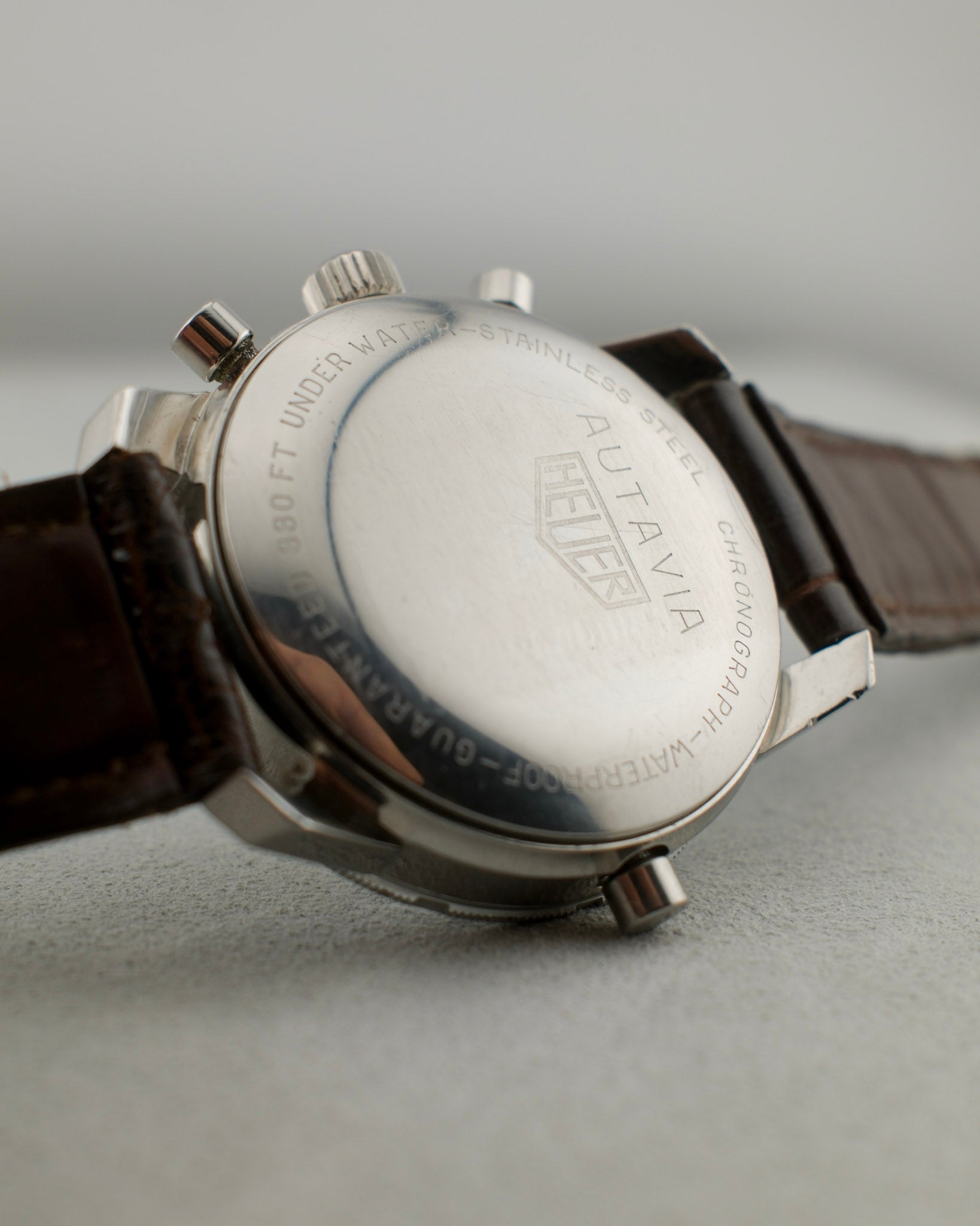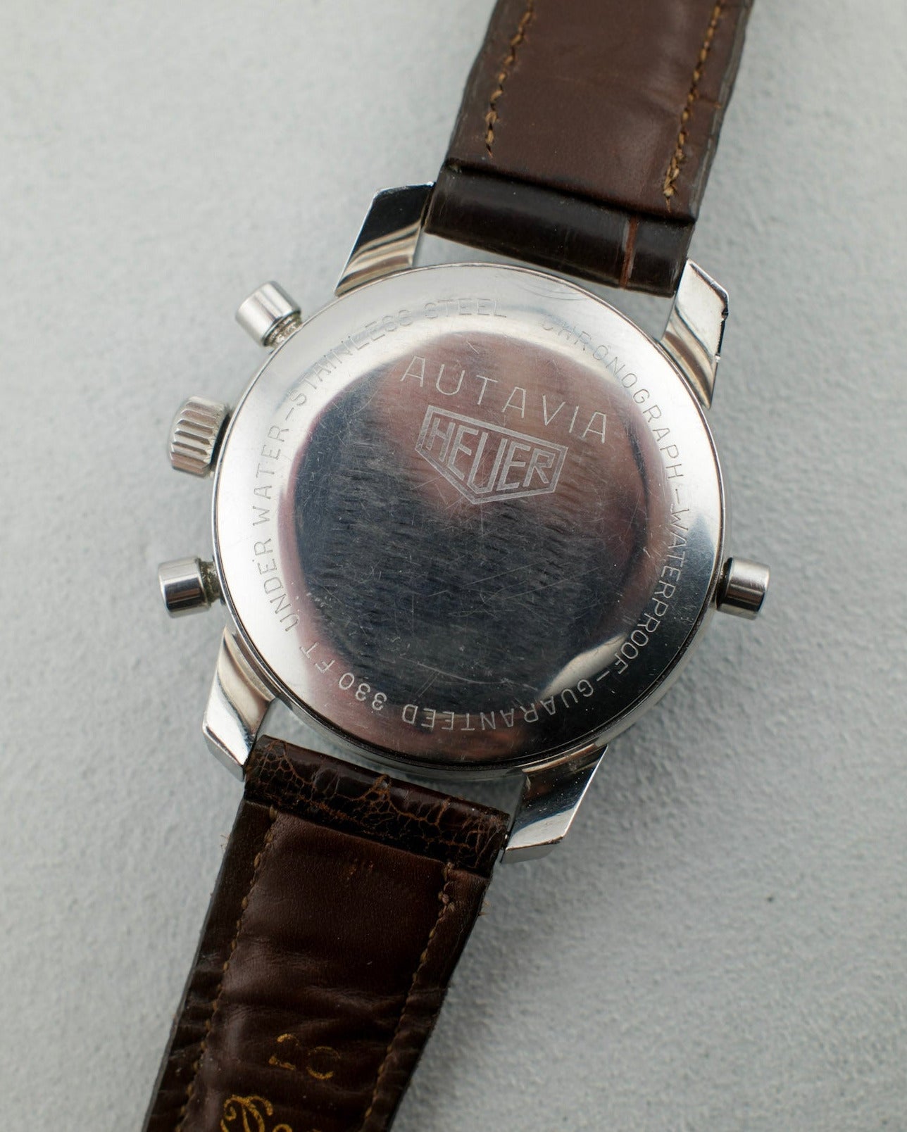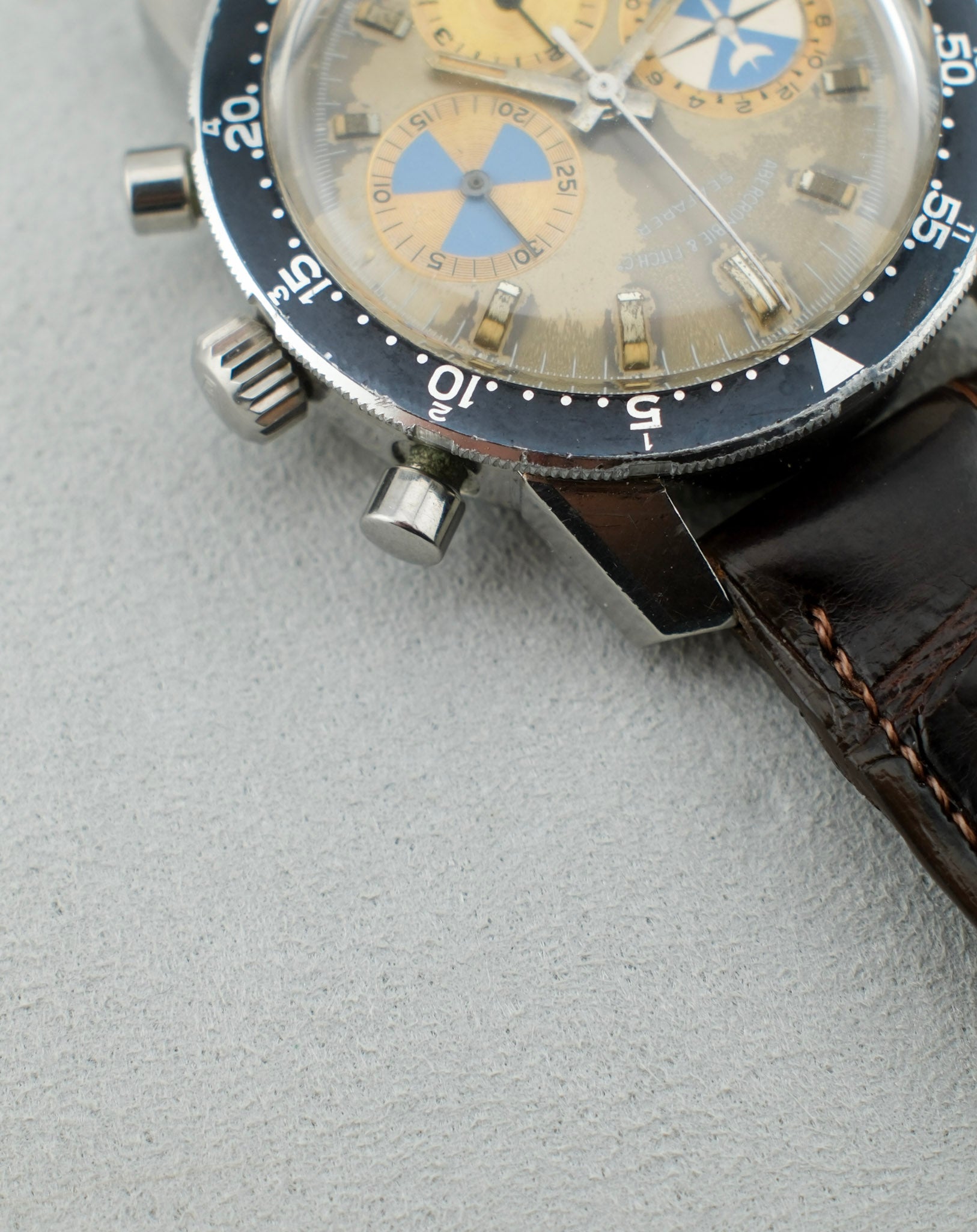 This Abercrombie & Fitch Co. / Heuer features a 40mm unpolished stainless steel case that sits in overall good condition for its age. It shows light scratches throughout and a few small dings to its lugs. Its case back shows light scratches, most notably to what would be its 12 o'clock area. Its bezel shows light wear to its surface and some smaller dings to its steel edge. its dial shows an eye-catching patina with its grey surface having turned to a champagne color in areas. Its sub-registers have turned to a brighter gold/champagne color as well with some small marks visible in areas. It sports applied hour markers, steel stick hands, and a white central chronograph seconds hand. Its chronograph functions and resets properly and showcases good tidal function. This piece is powered by a cal. 721 movement and is fitted with a dark brown genuine crocodile leather strap and steel buckle. Its crystal sits in good condition. Overall, this Seafarer sits in great vintage condition, showing an incredible patina and wear consistent with its age.