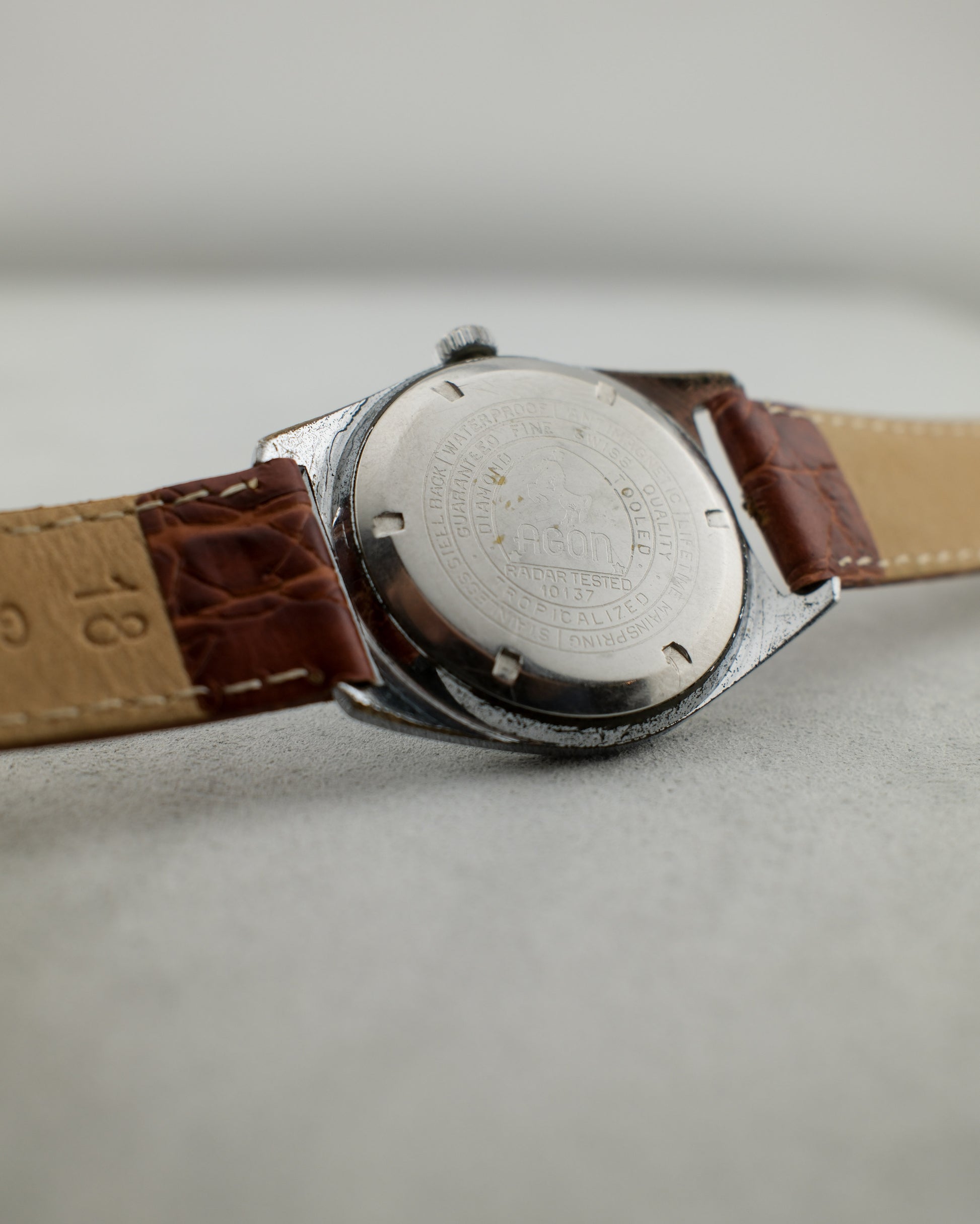Agon is one of the many lesser-known Swiss brands that flourished during the postwar boom, often producing reliable, affordable watches using robust ébauche movements. The use of the Ebauches Bettlach (EB) 8021 movement, a workhorse manual caliber, ensured straightforward maintenance and dependable performance. Watches like this are valued today for their honest, utilitarian design and for representing the accessible side of Swiss watchmaking during a period of global expansion.