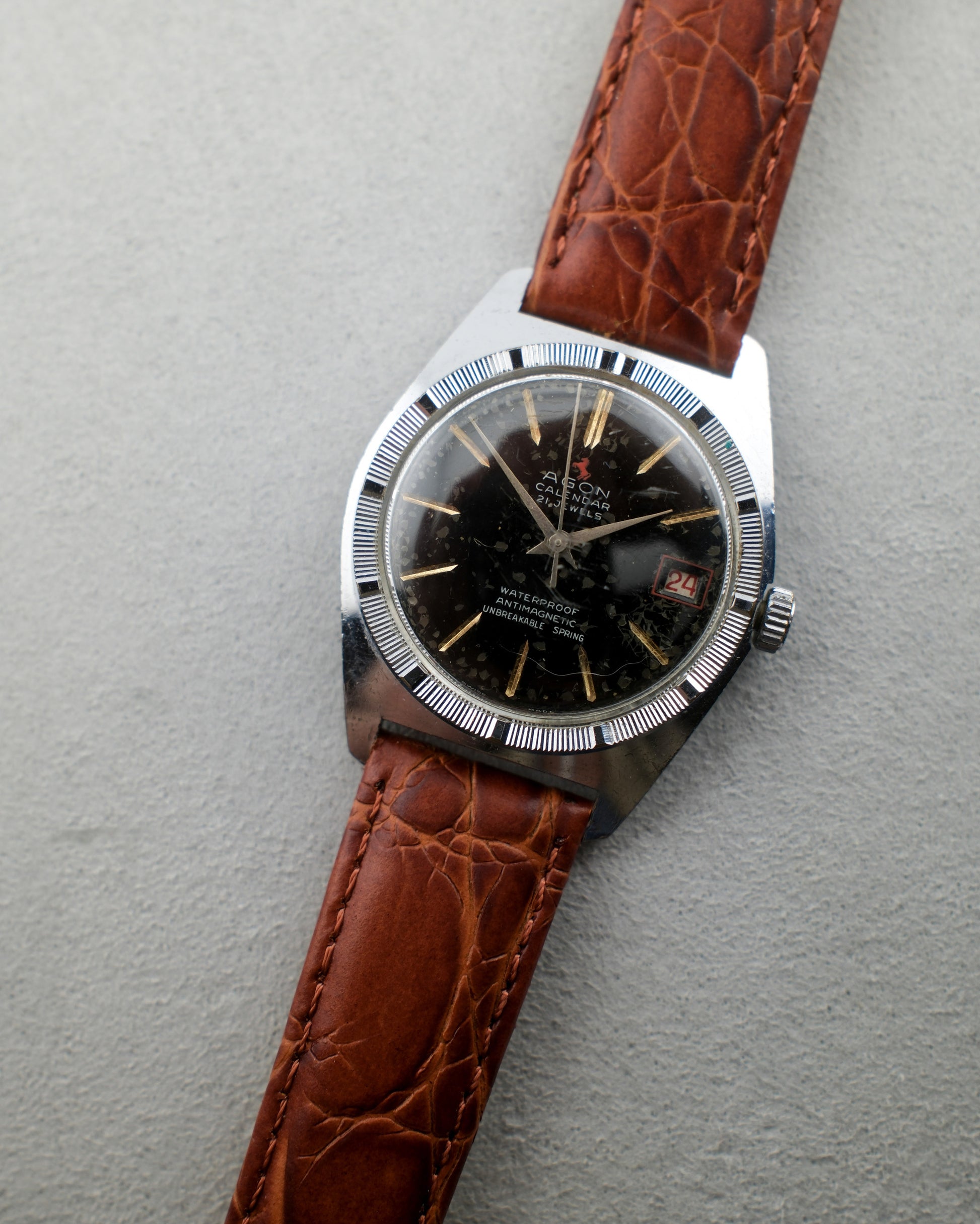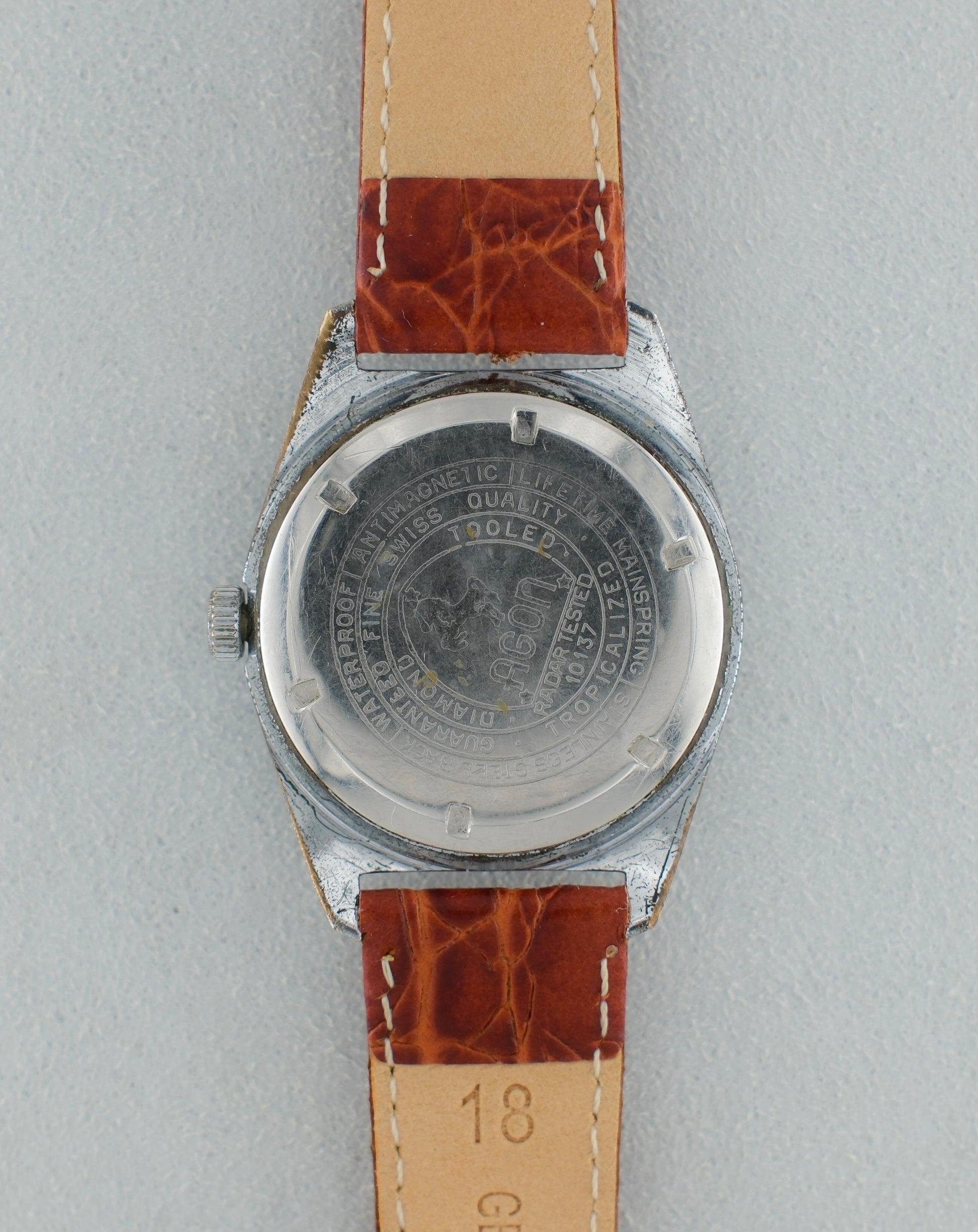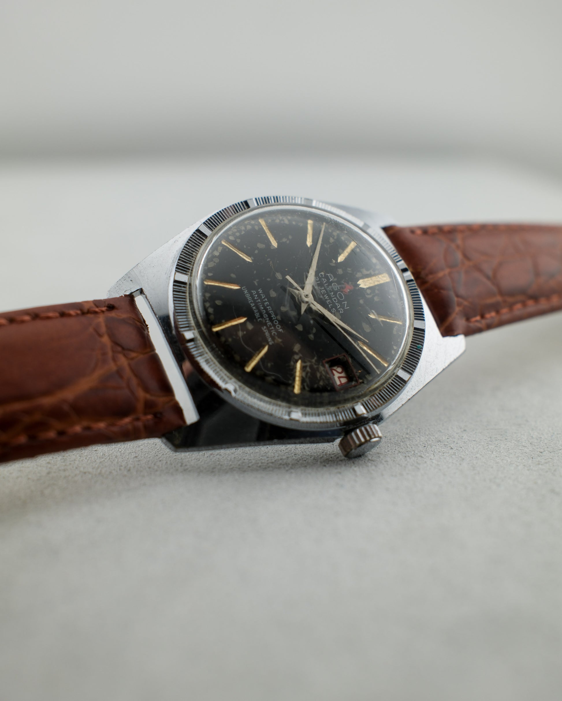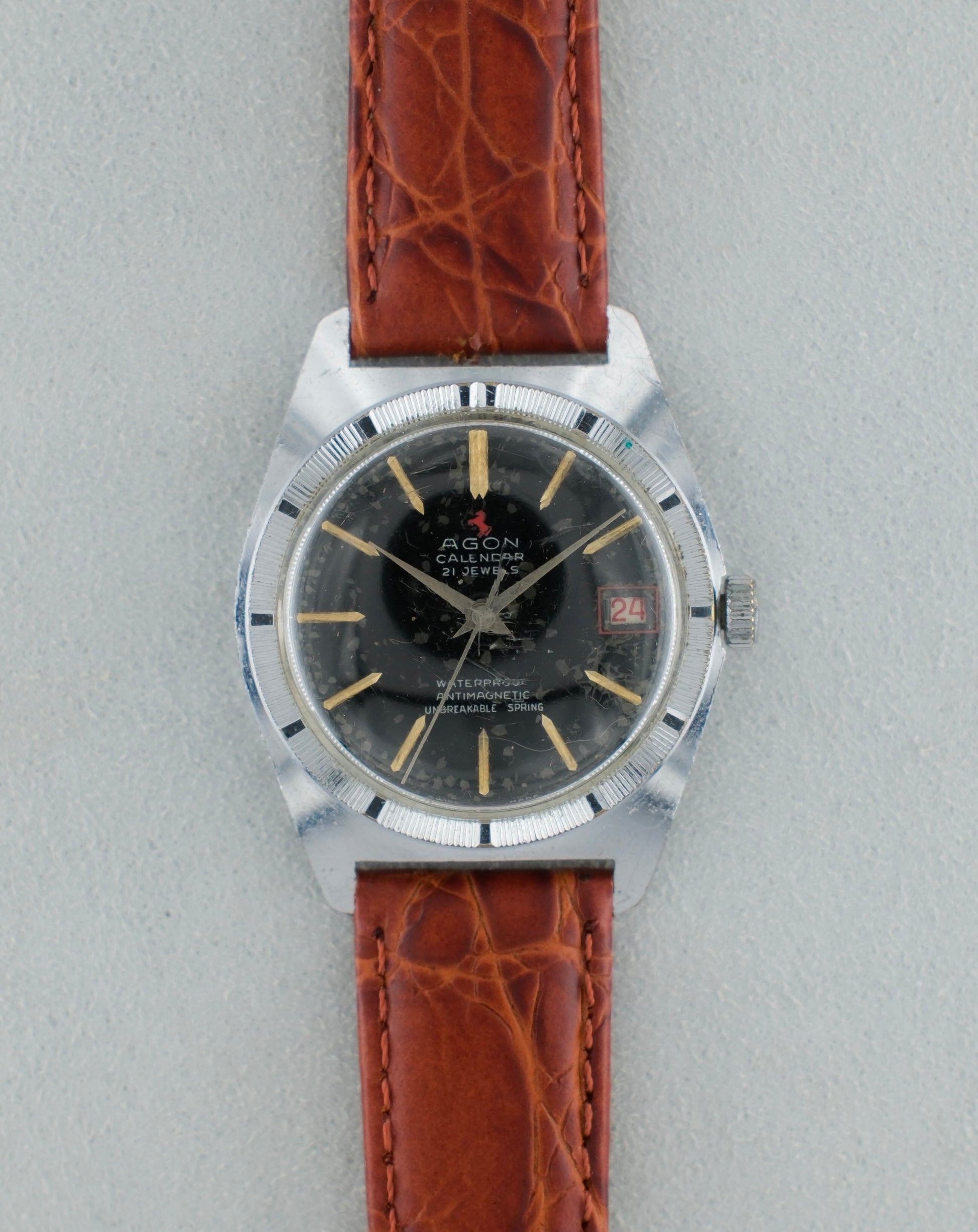 This Agon features a 34mm base metal and steel backed case that sits in overall fair condition. It shows visible scratches throughout most notably to the rear of its lugs. Its black dial shows noticeable spotting and wear. Though, this eye-catching speckling adds to the unique aesthetic of the watch overall. It sports gold colored hour markers, dauphine hands, and a date window at 3 o’clock. This piece is powered by a 21-jeweled manual-wind movement and is fitted with a deep red leather strap and steel buckle. Its crystal sits in fair condition with noticeable scratches to its surface. Overall, this Agon sits in fair vintage condition, showing wear consistent with its age.