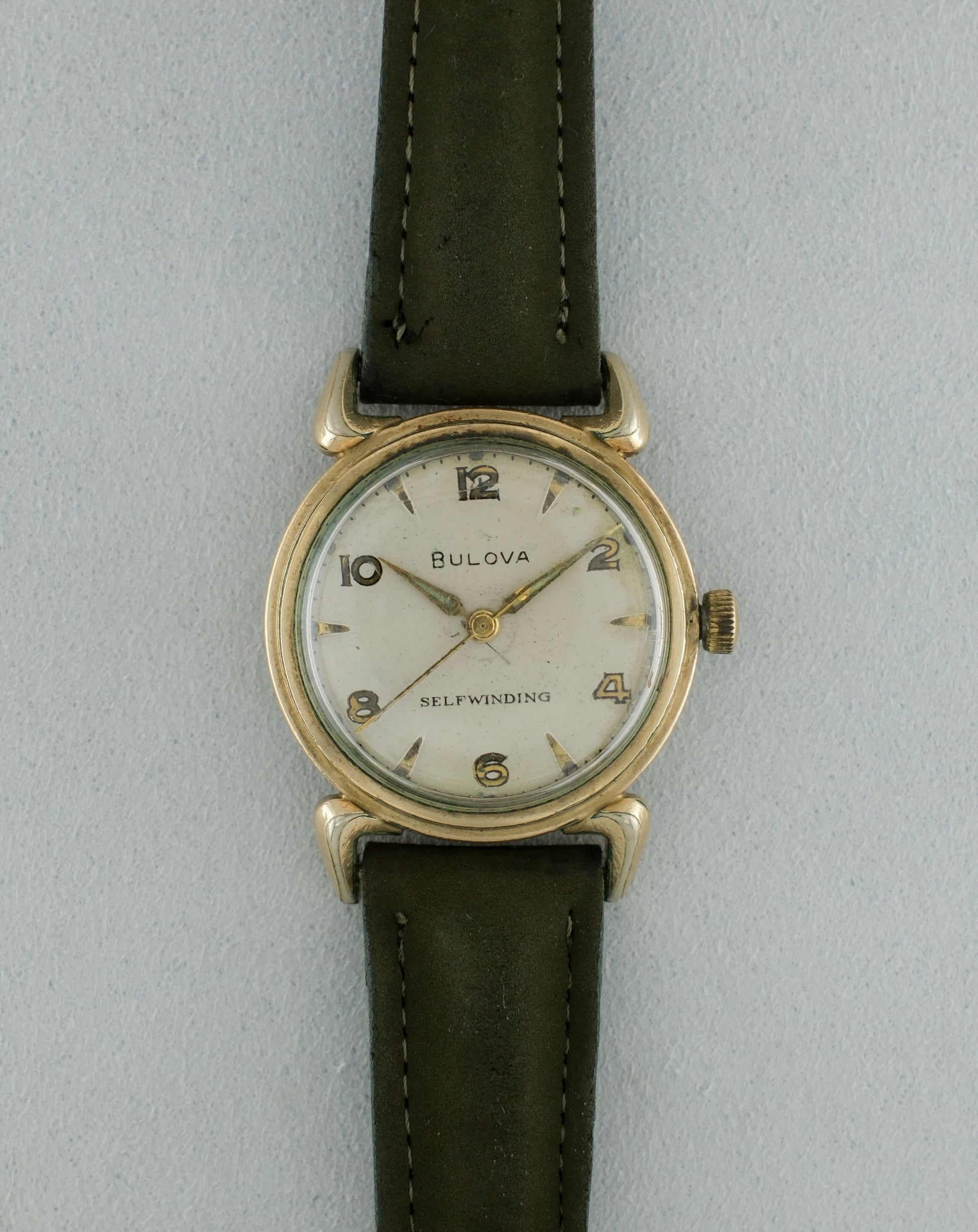 A classic mid-20th century design. The dial of this Bulova features Arabic numbers, and pointed indices. Complimentary to the dauphine-style hands and striking pointed lug design. Its dial has experienced consistent wear throughout. Additionally, the case of this watch features patina throughout, specifically as it approaches the crystal. Reach out for any questions regarding condition.