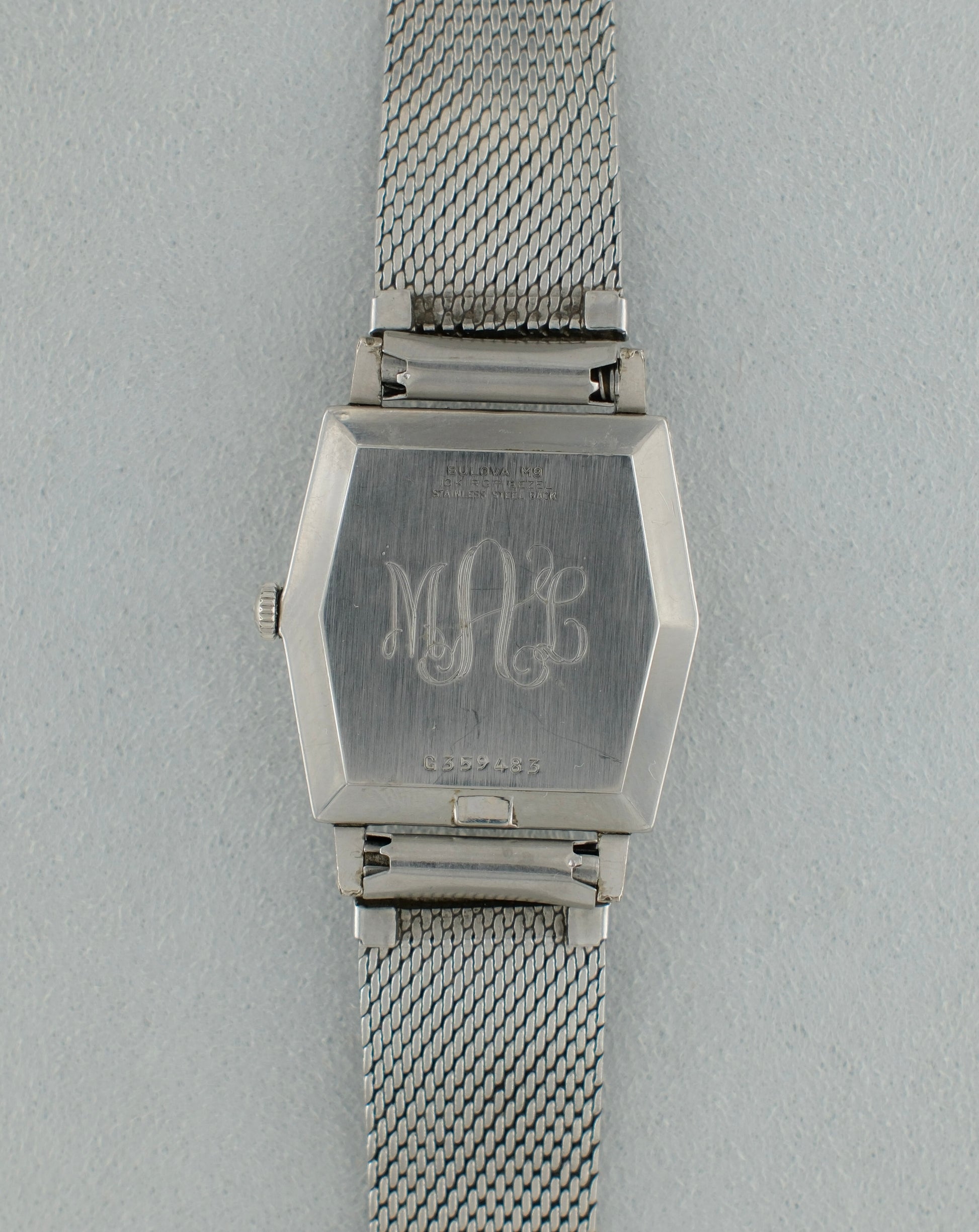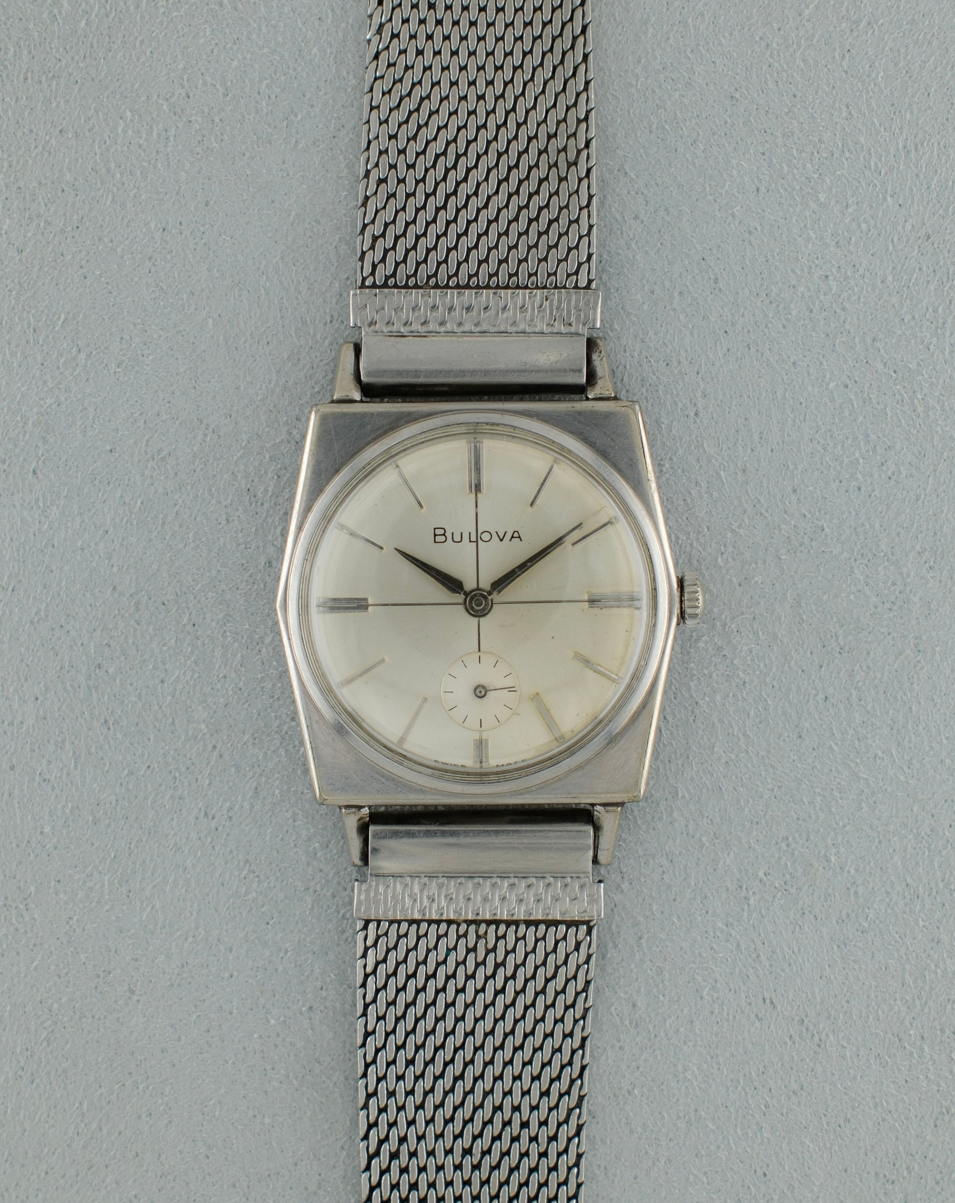 This Bulova features a 29mm steel case that sits in overall good condition. It sports an elegant engraving on its case back stating “MAL”. Its silver dial is clean, with applied hour markers and a small-seconds complication at 6 o’clock. This piece is powered by a manual-wind movement and is fitted with a steel mesh bracelet. Overall, this Bulova sits in good vintage condition, showing wear consistent with its age.