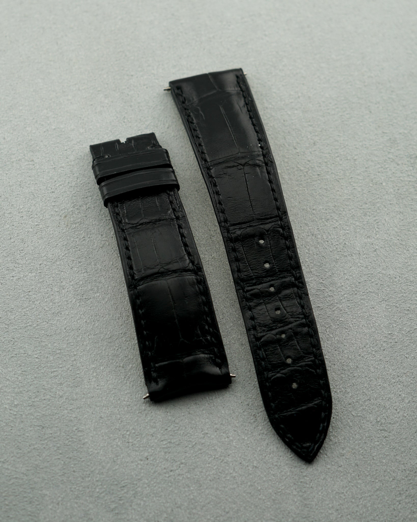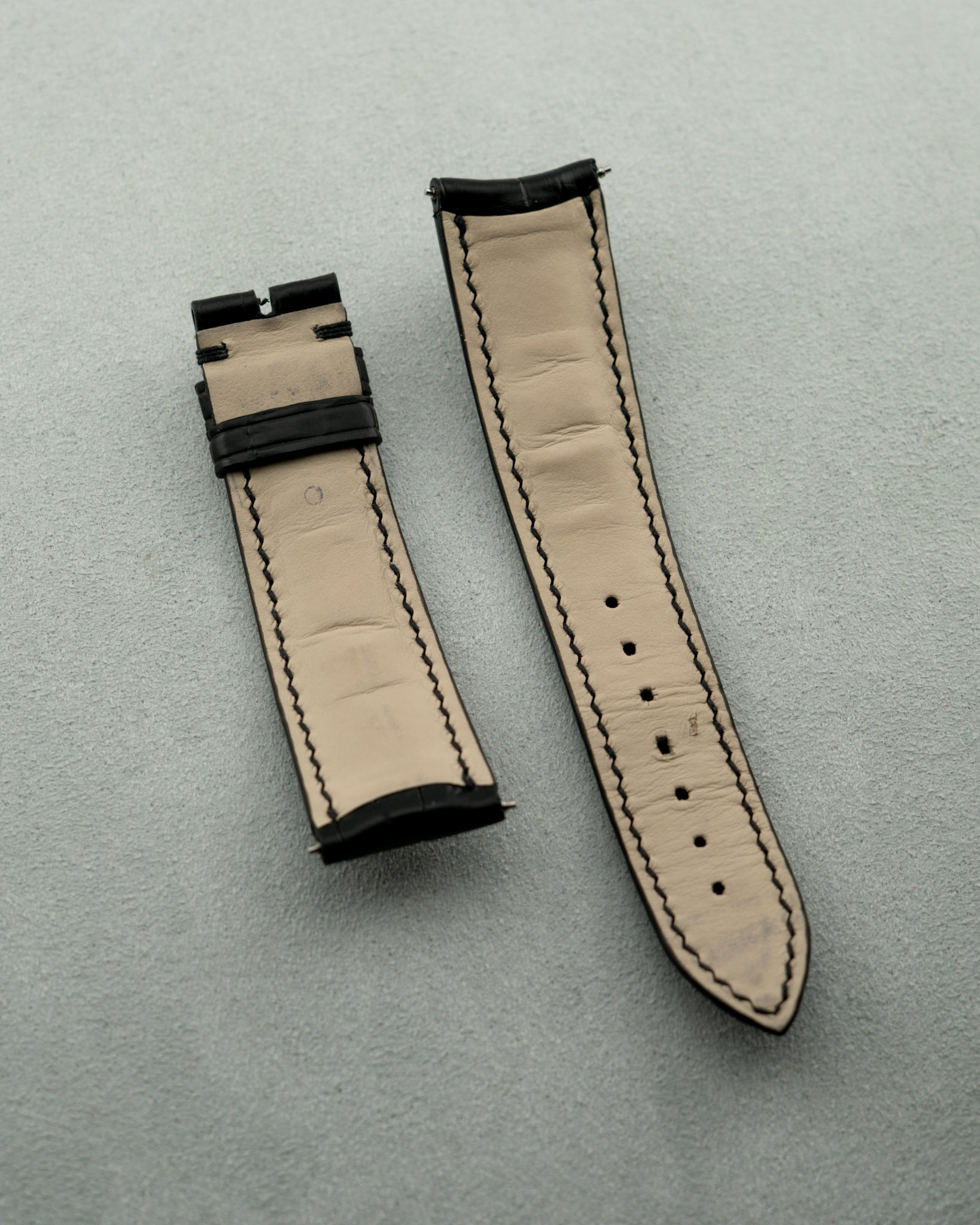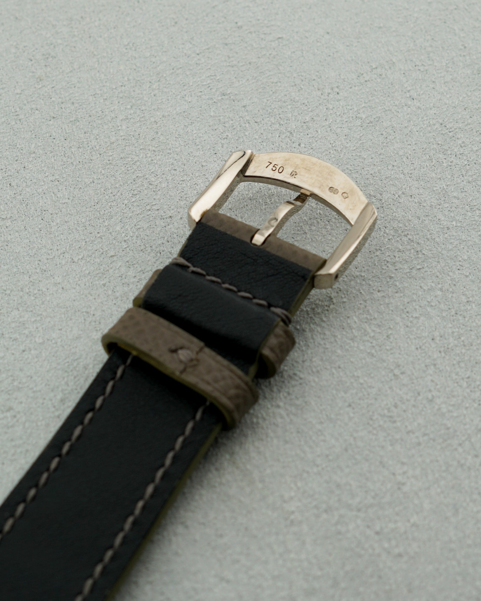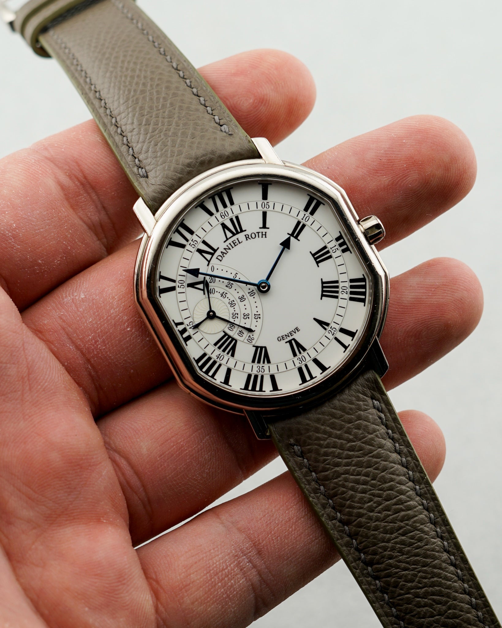 This Daniel Roth features a 41mm double ellipse 18 karat white gold case that sits in overall good unpolished condition. It exhibits expected light scratches and dings from careful wear. There a no major notable marks, but dings can be seen upon close inspection. Its white dial sits in perfect condition, with roman numeral hour markers, flame blued arrow hands, and a 9 o’clock placed small seconds that operates off of a three pointed hand. We especially love the small slot cut into the inside of the case to make room for its longest arm to cleanly rotate. This piece is powered by a 20-jeweled manually wound movement and is fitted with an aftermarket grey genuine leather strap its 18 karat white gold branded buckle. The watch also comes delivered with its original black leather strap and can be put back onto the watch if requested. Its crystal sits in great condition. It includes original box, though we will note again that the insert it’s typically joined with is not present. Overall, this Daniel Roth sits in very good condition, showing wear consistent with years of careful wear.