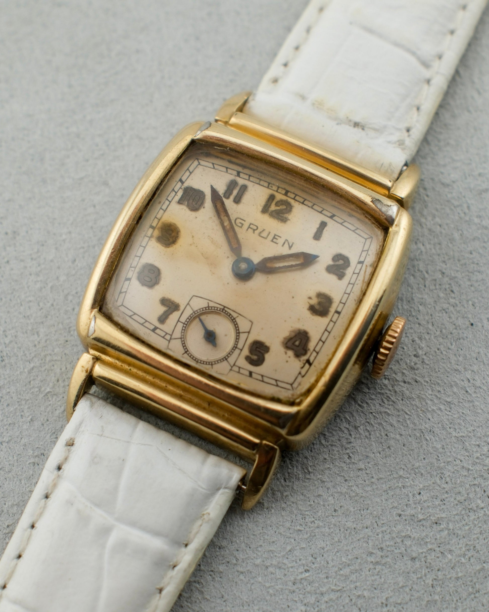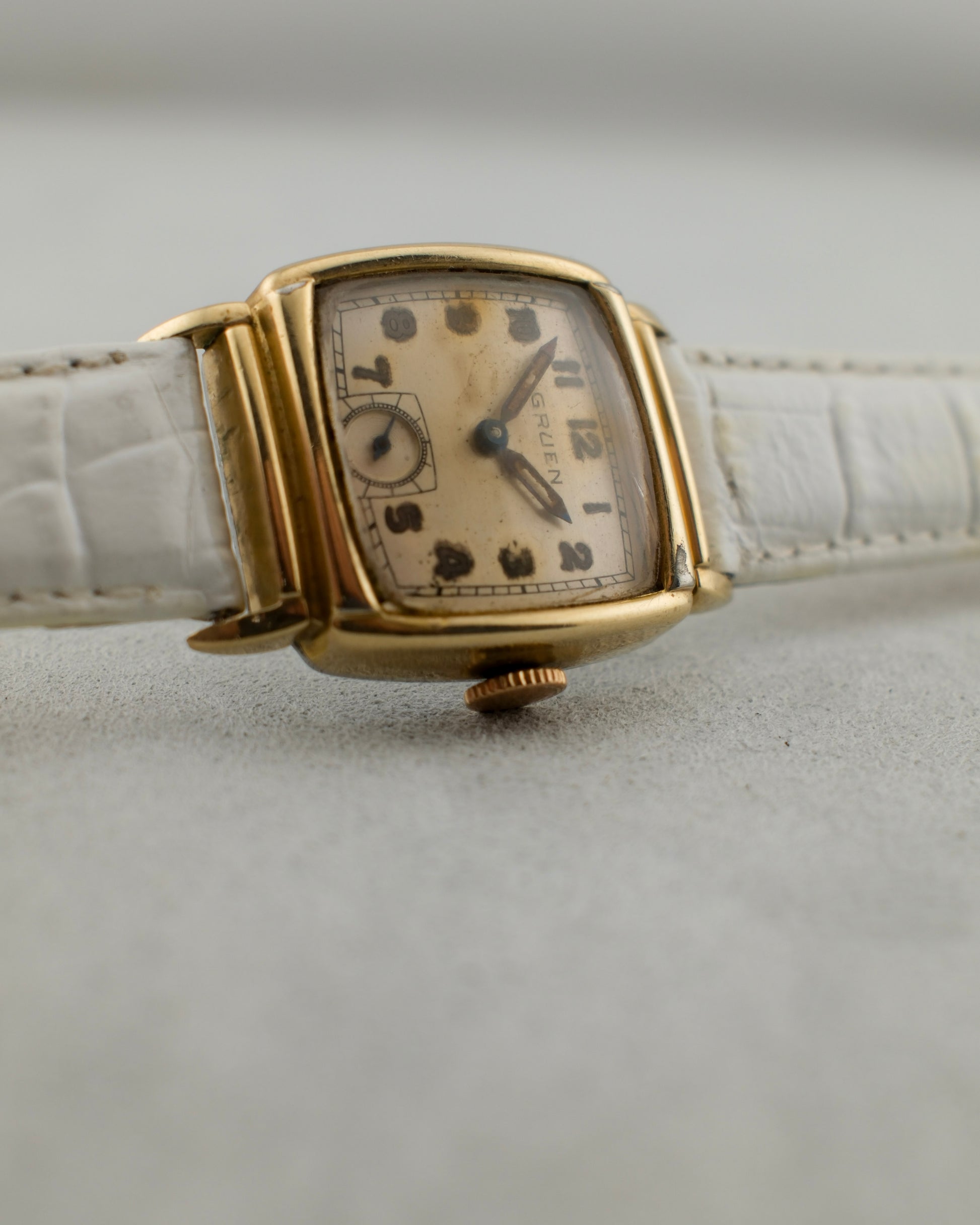 The dial on this Gruen displays a well-developed patina, giving it a warm hue that compliments the gold plating of the case. The applied hour markers have aged notably, taking on a rich, golden tone that contrasts with the dial's patina. This uniform aging of both the dial and markers creates a harmonious, authentic vintage look. Note the sub-seconds register at the 6 o'clock position adding additional complication to this timepiece.
