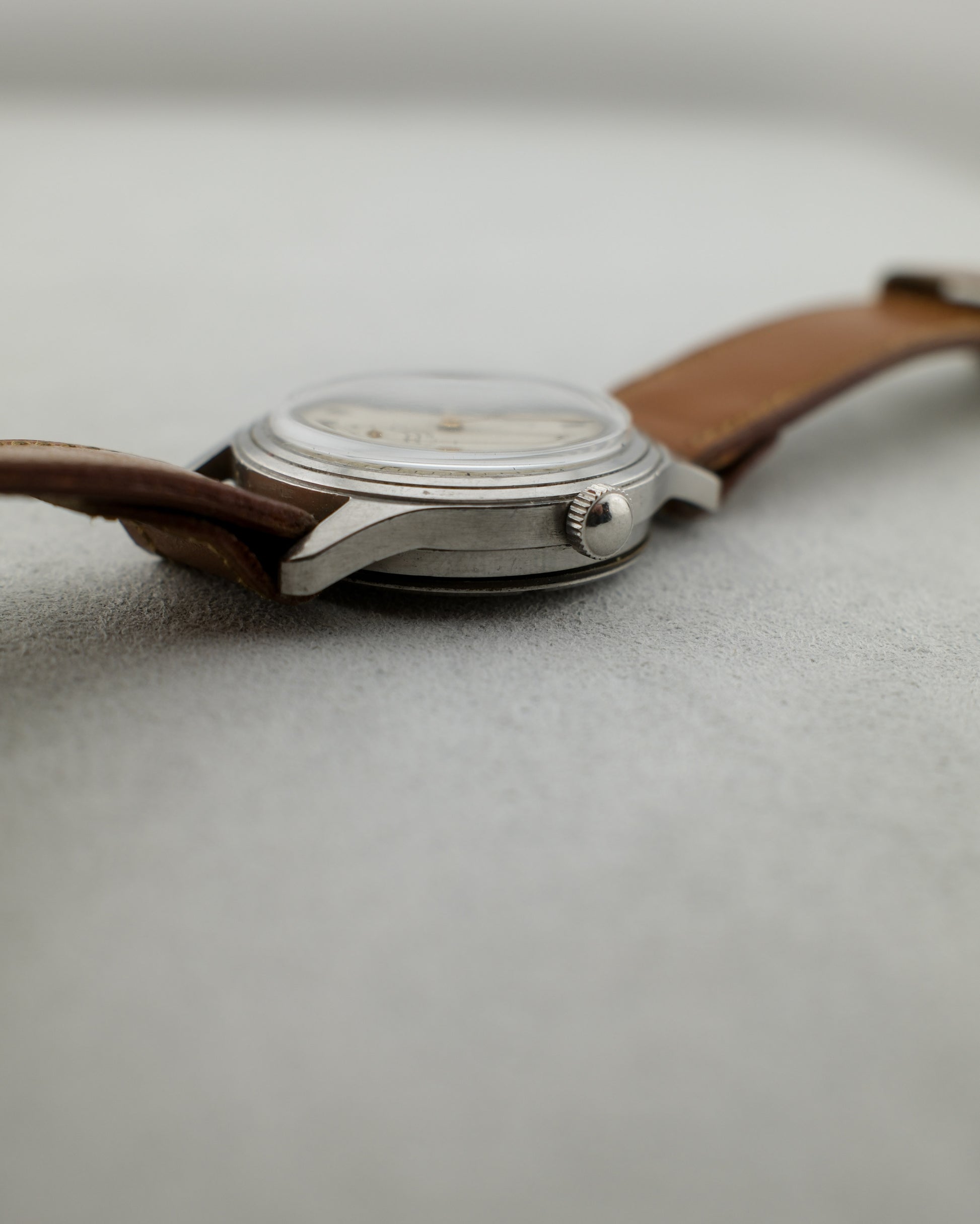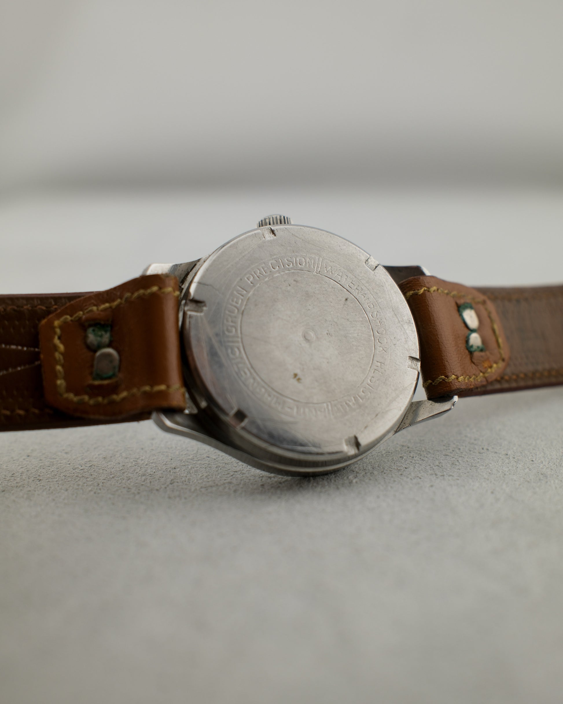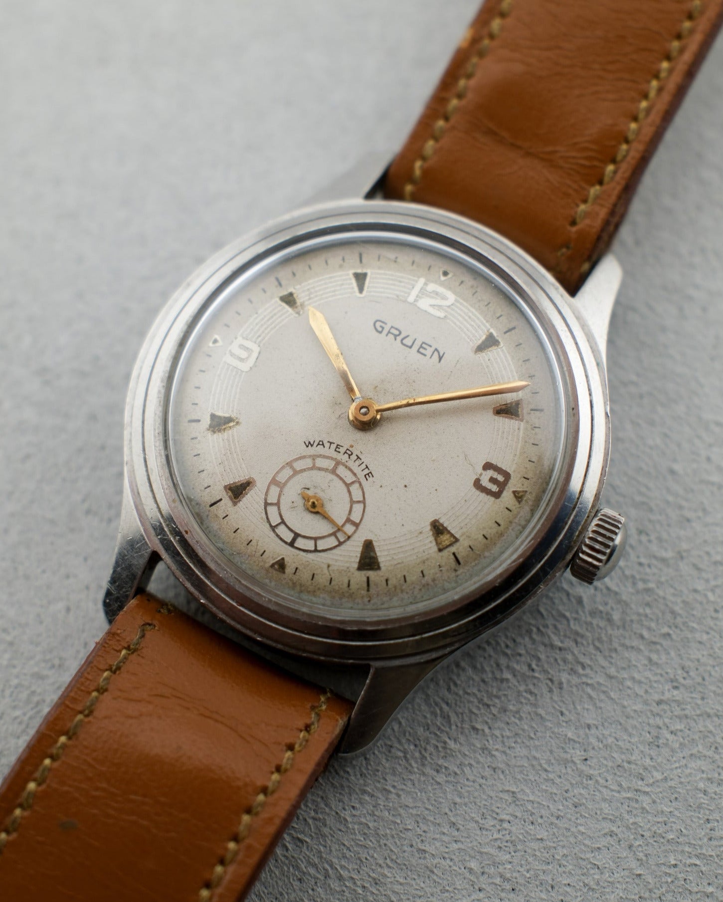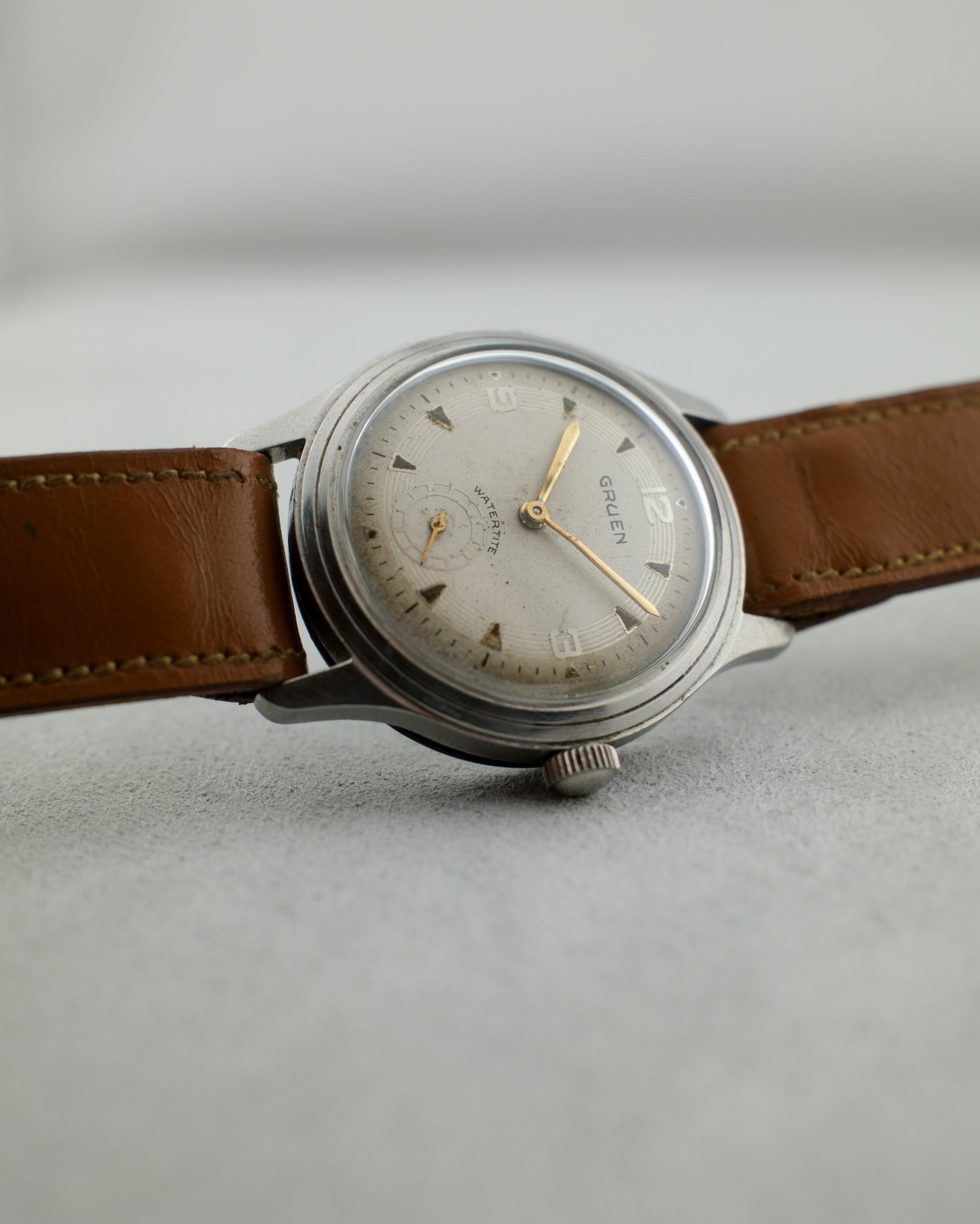 Watertite design with sub-seconds complication, showcasing Gruen's commitment to both functionality and style during the mid-20th century. The case sits in good condition. The case back shares more substantial wear marks/scratches. The dial is in great condition and sports a pair of gold minute and hour hands as well as a gold sub-seconds hand.