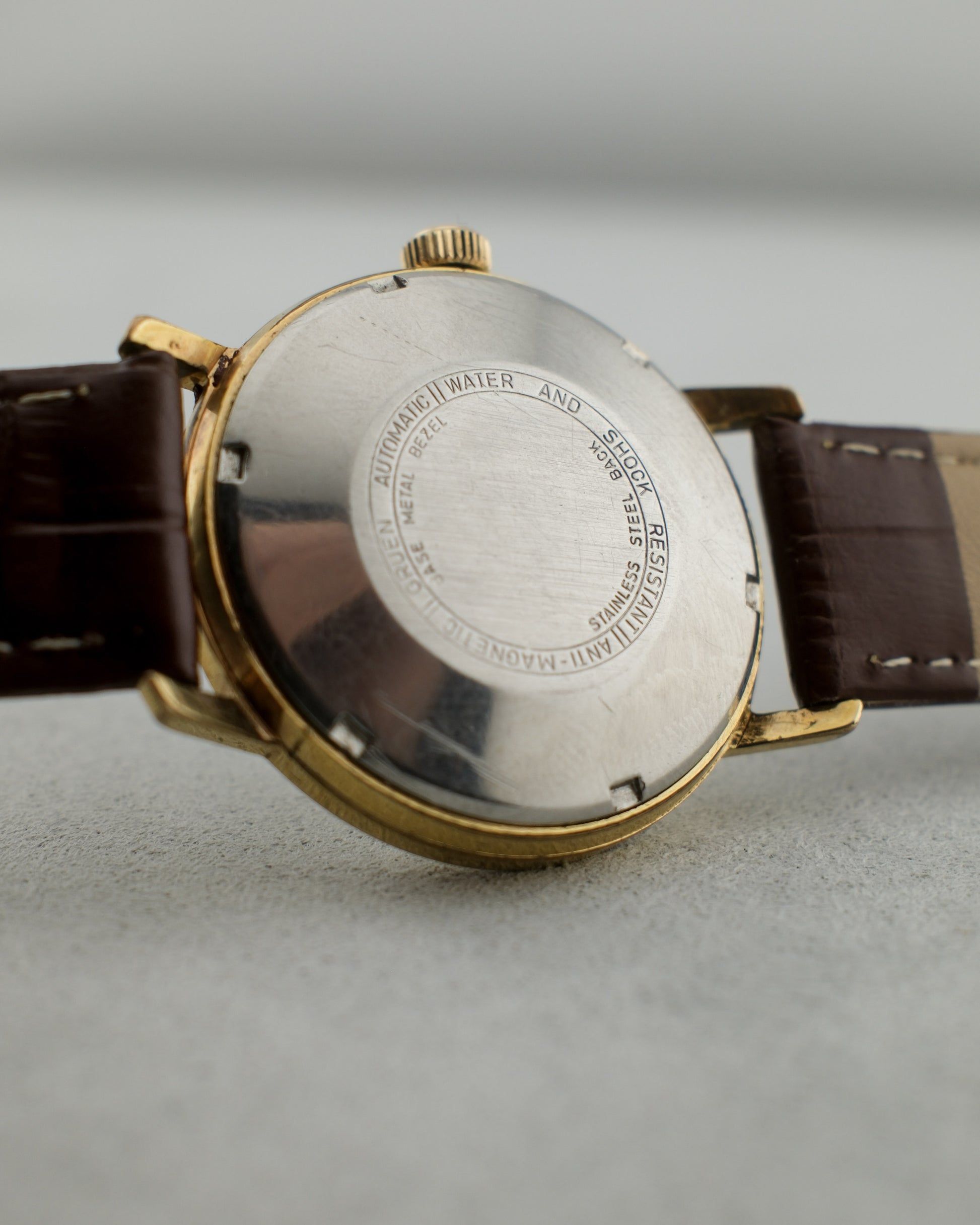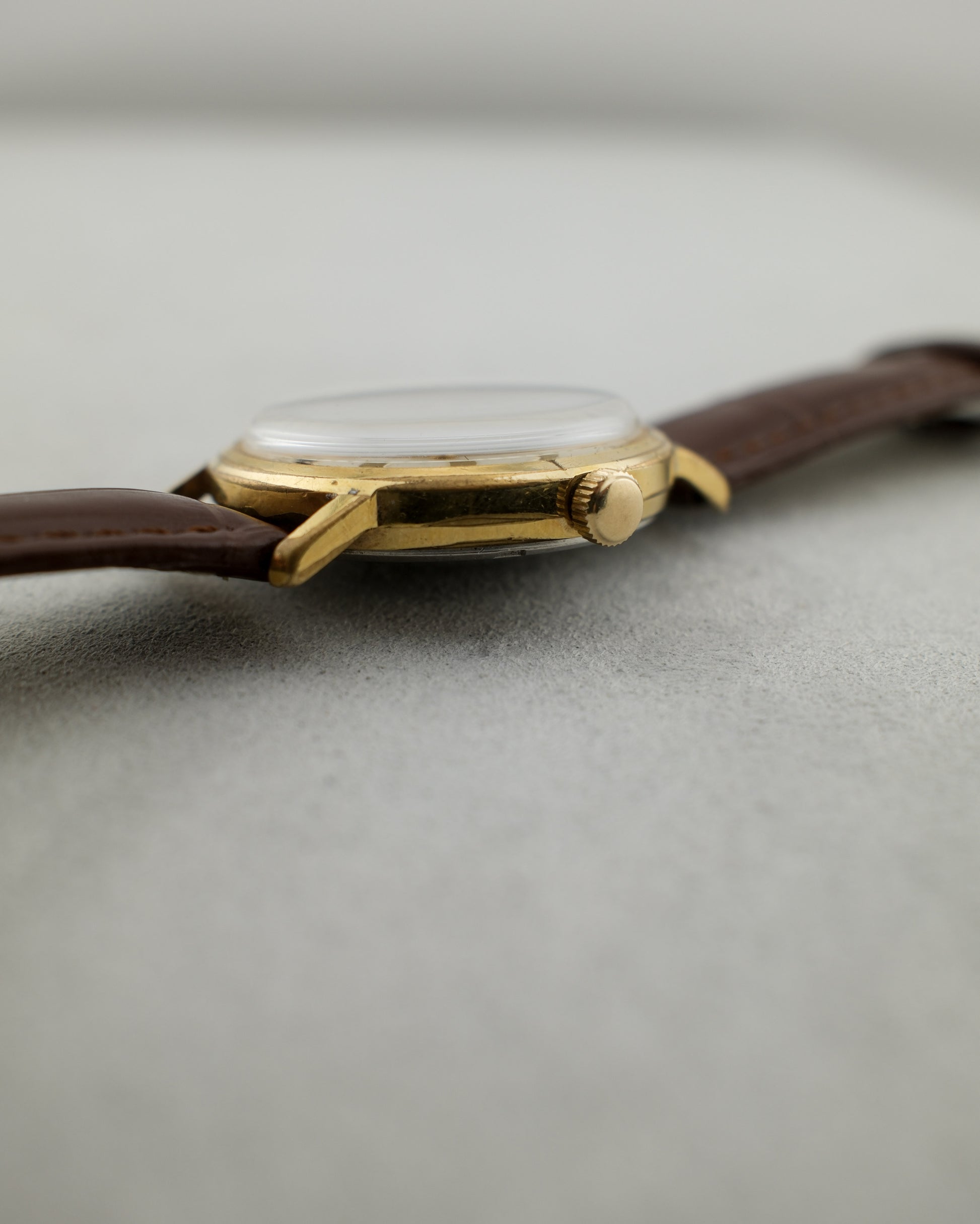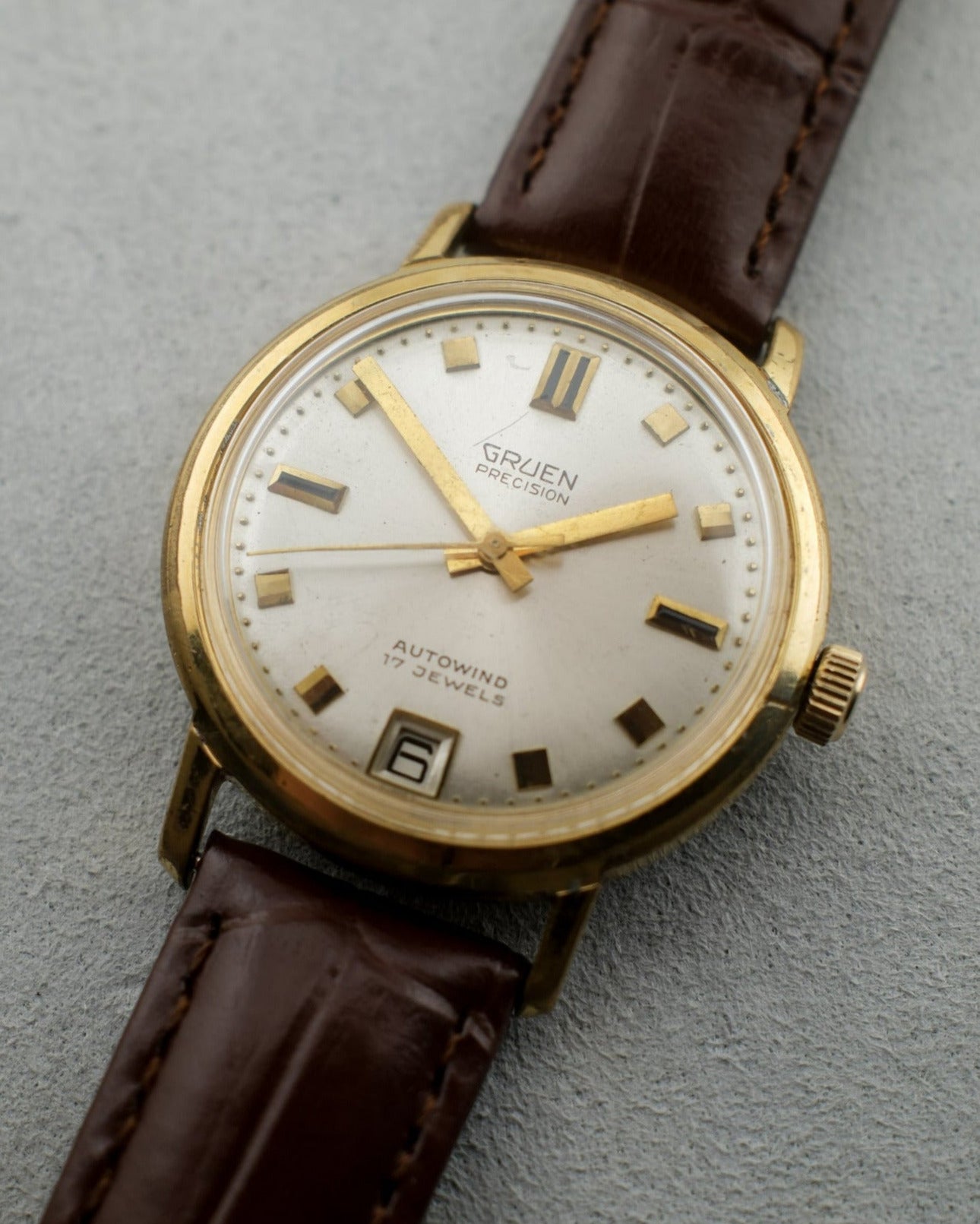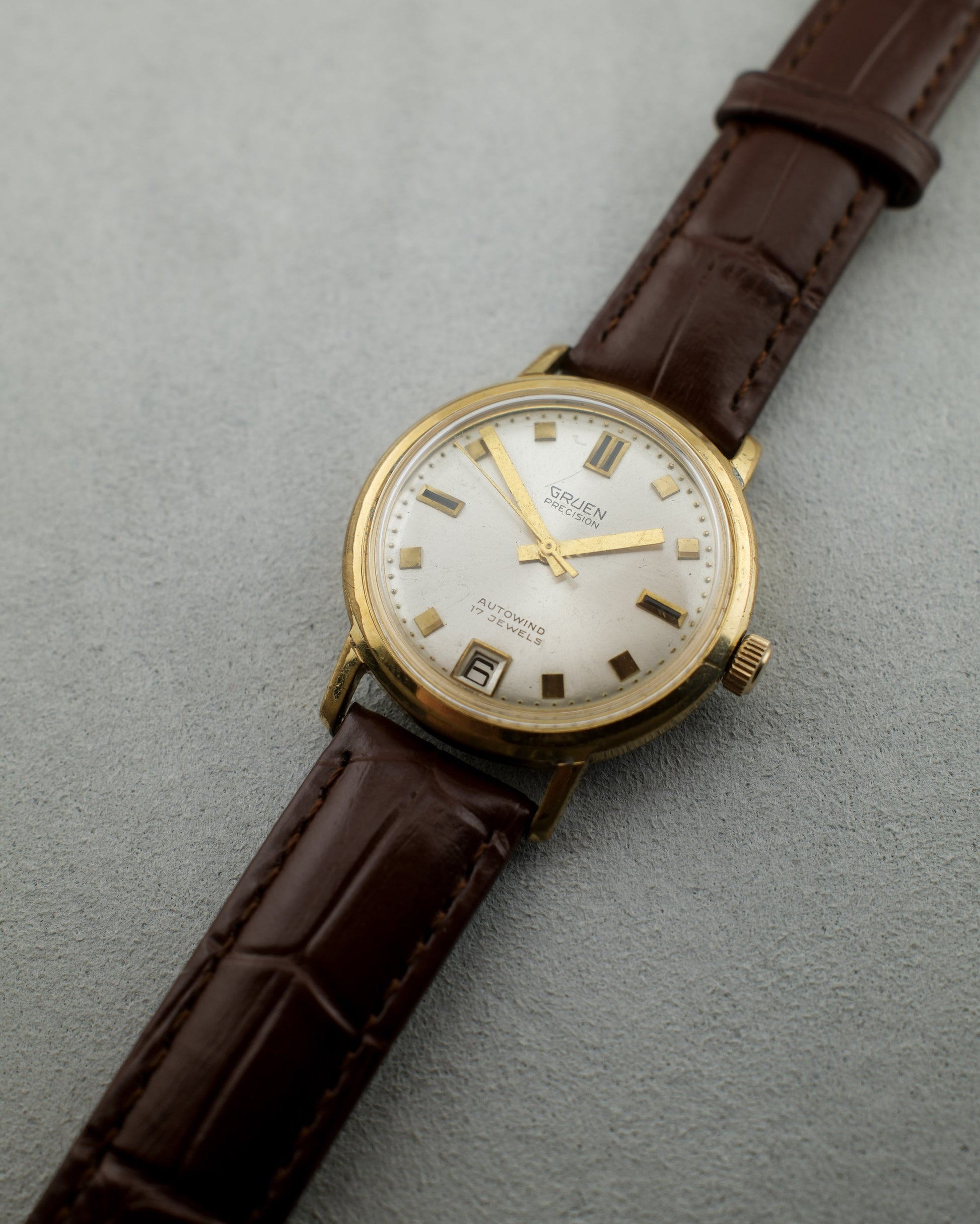 The gorgeous plated gold case of this Gruen Precision sits in good condition with a small nick near the base of the crown. The flat-tipped hands are complimentary to the indices on the dial. We particularly enjoy the black inlays on the 3, 9, and 12 o'clock positions as they add a striking visual appeal against its silvered dial. With its narrow lugs, this piece exudes vintage charm while adding a level of complication with its date window at the 6 o'clock position.