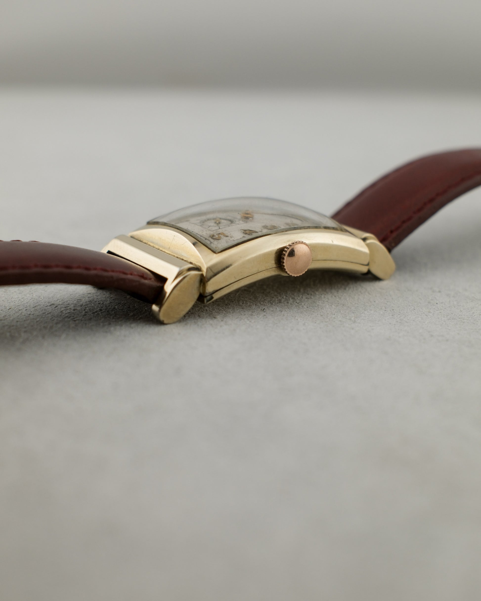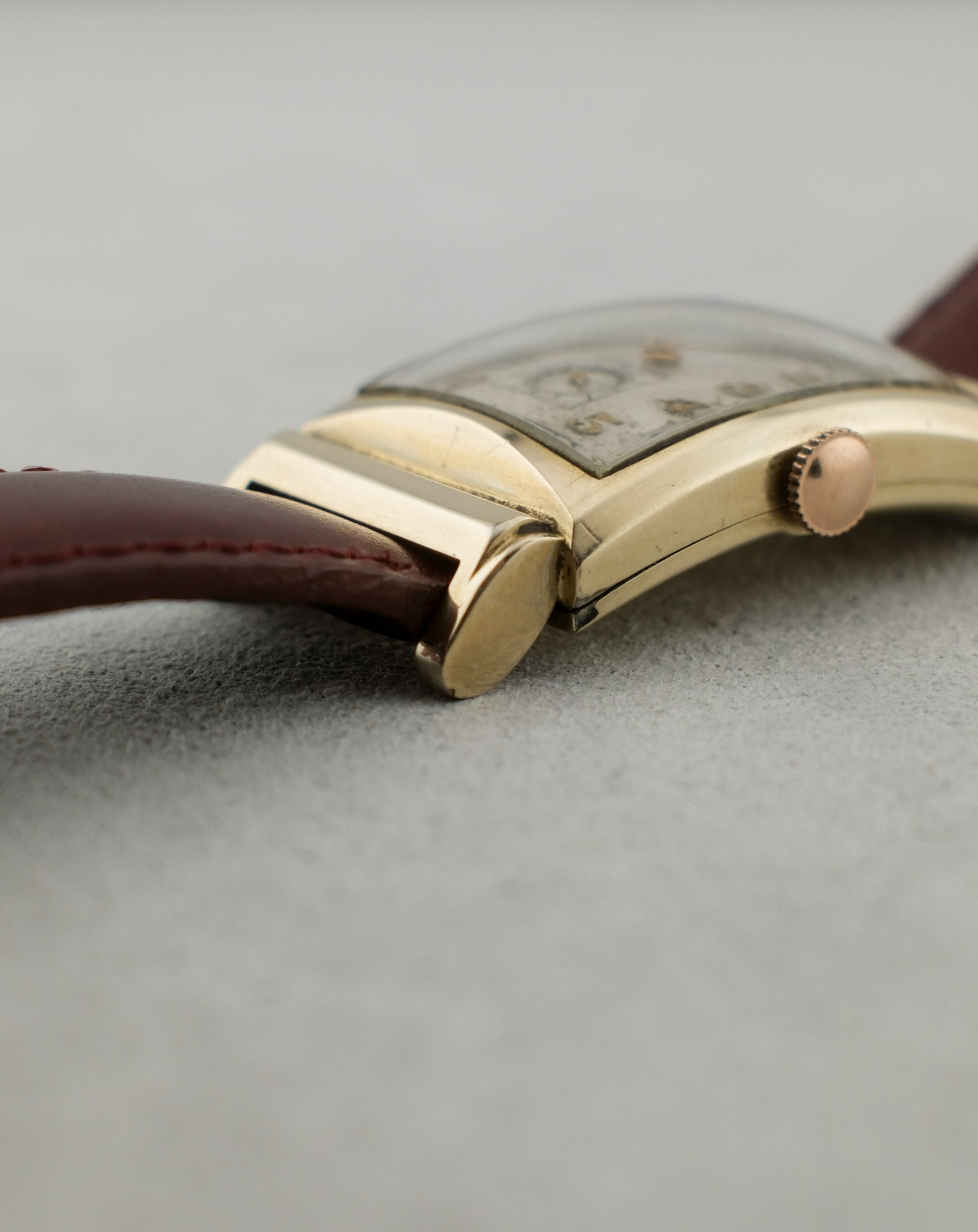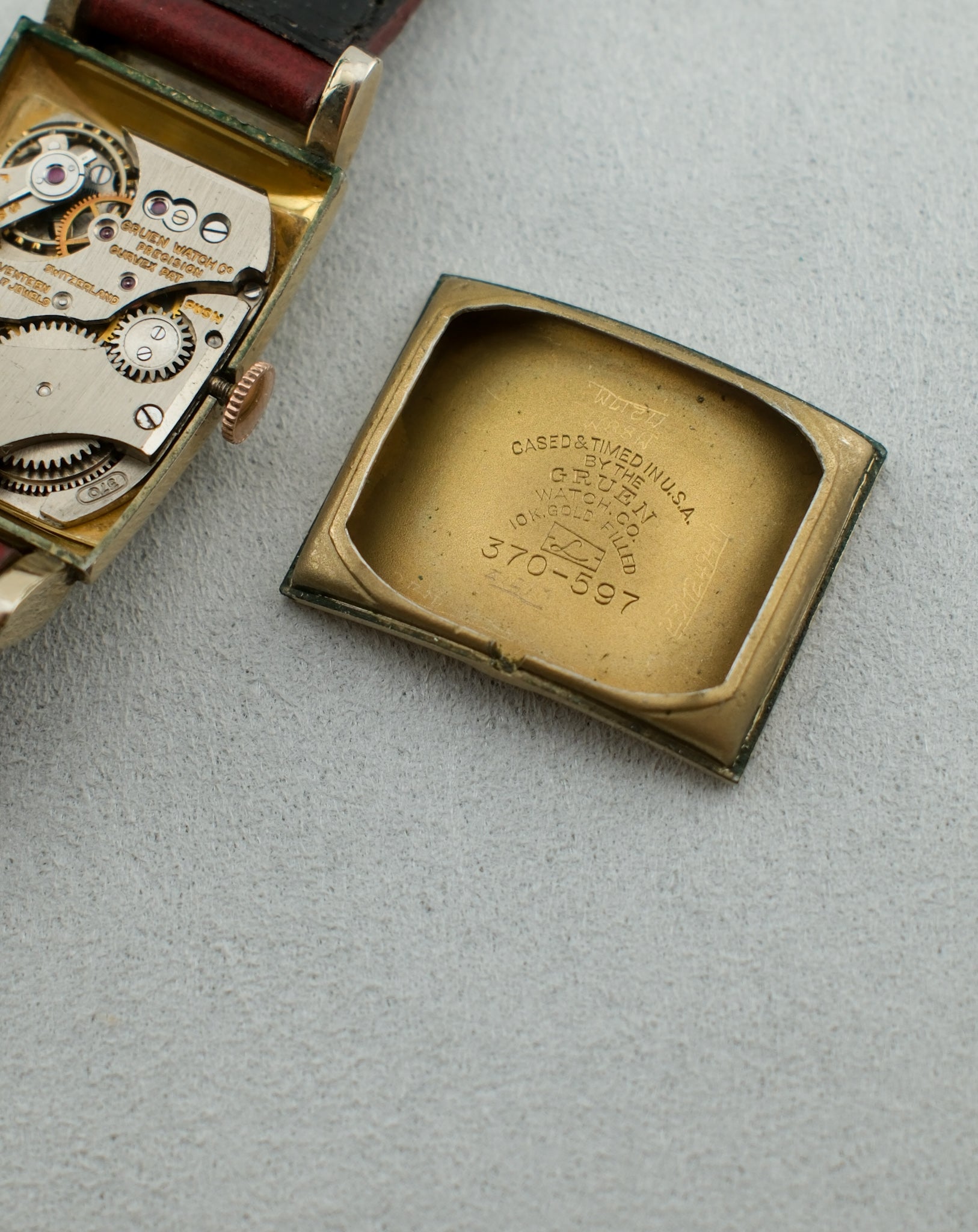 Gruen, founded in 1894 in Cincinnati, Ohio, was one of the largest and most influential American watch manufacturers through the first half of the 20th century. The company became especially renowned for its innovative case and movement designs, blending Swiss and American watchmaking expertise. In 1935, Gruen introduced the Curvex-a revolutionary wristwatch that featured a curved case and, crucially, a curved movement designed to follow the contour of the wrist. This allowed for a larger, more robust movement in a slim, elegant case, setting the Curvex apart from competitors who used flat movements in curved cases. By the 1940s, Curvex models had become Gruen’s flagship line, celebrated for their streamlined Art Deco styling and engineering ingenuity.