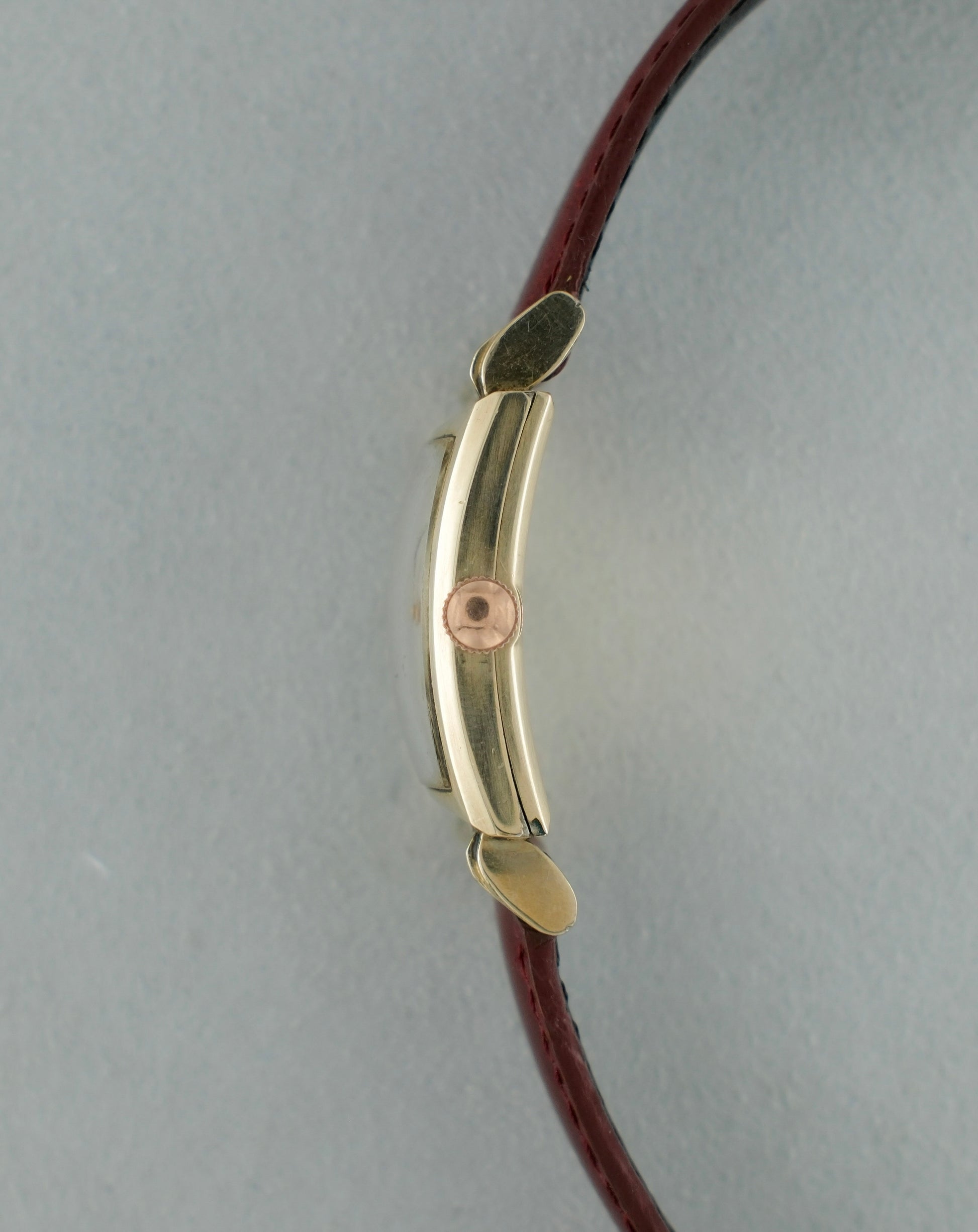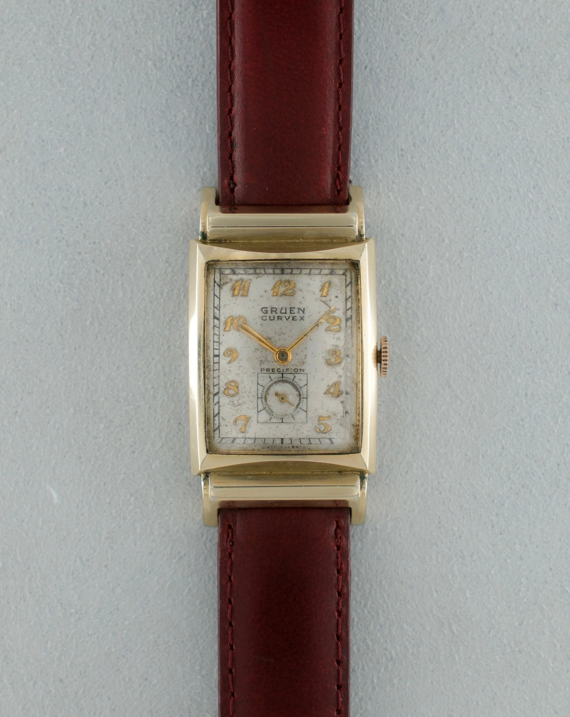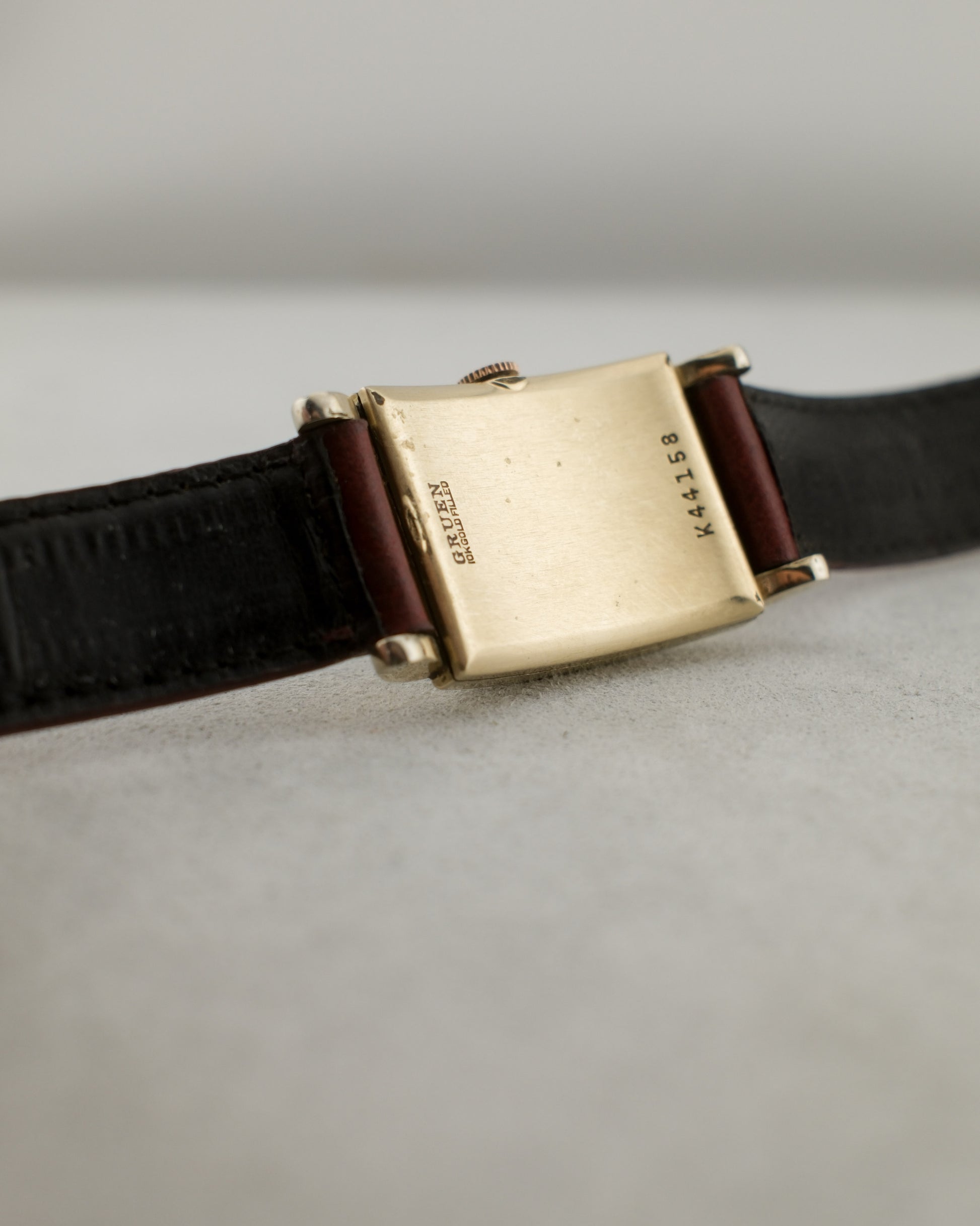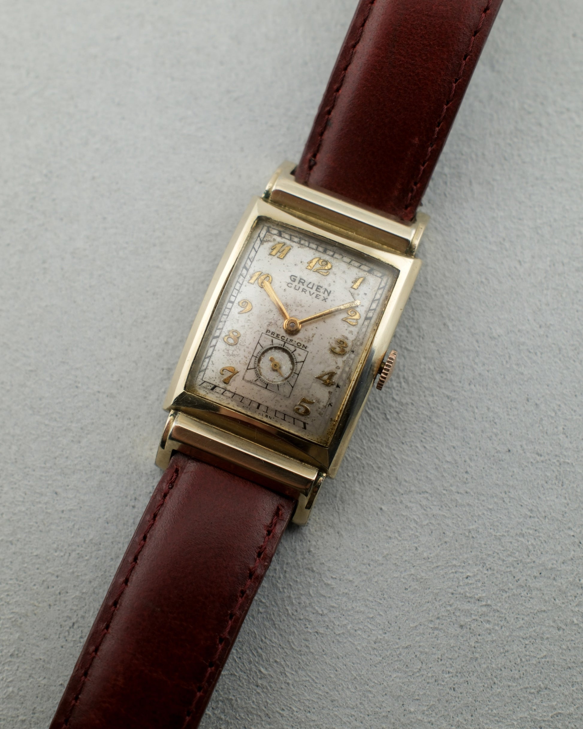 Gruen, founded in 1894 in Cincinnati, Ohio, was one of the largest and most influential American watch manufacturers through the first half of the 20th century. The company became especially renowned for its innovative case and movement designs, blending Swiss and American watchmaking expertise. In 1935, Gruen introduced the Curvex-a revolutionary wristwatch that featured a curved case and, crucially, a curved movement designed to follow the contour of the wrist. This allowed for a larger, more robust movement in a slim, elegant case, setting the Curvex apart from competitors who used flat movements in curved cases. By the 1940s, Curvex models had become Gruen’s flagship line, celebrated for their streamlined Art Deco styling and engineering ingenuity.
