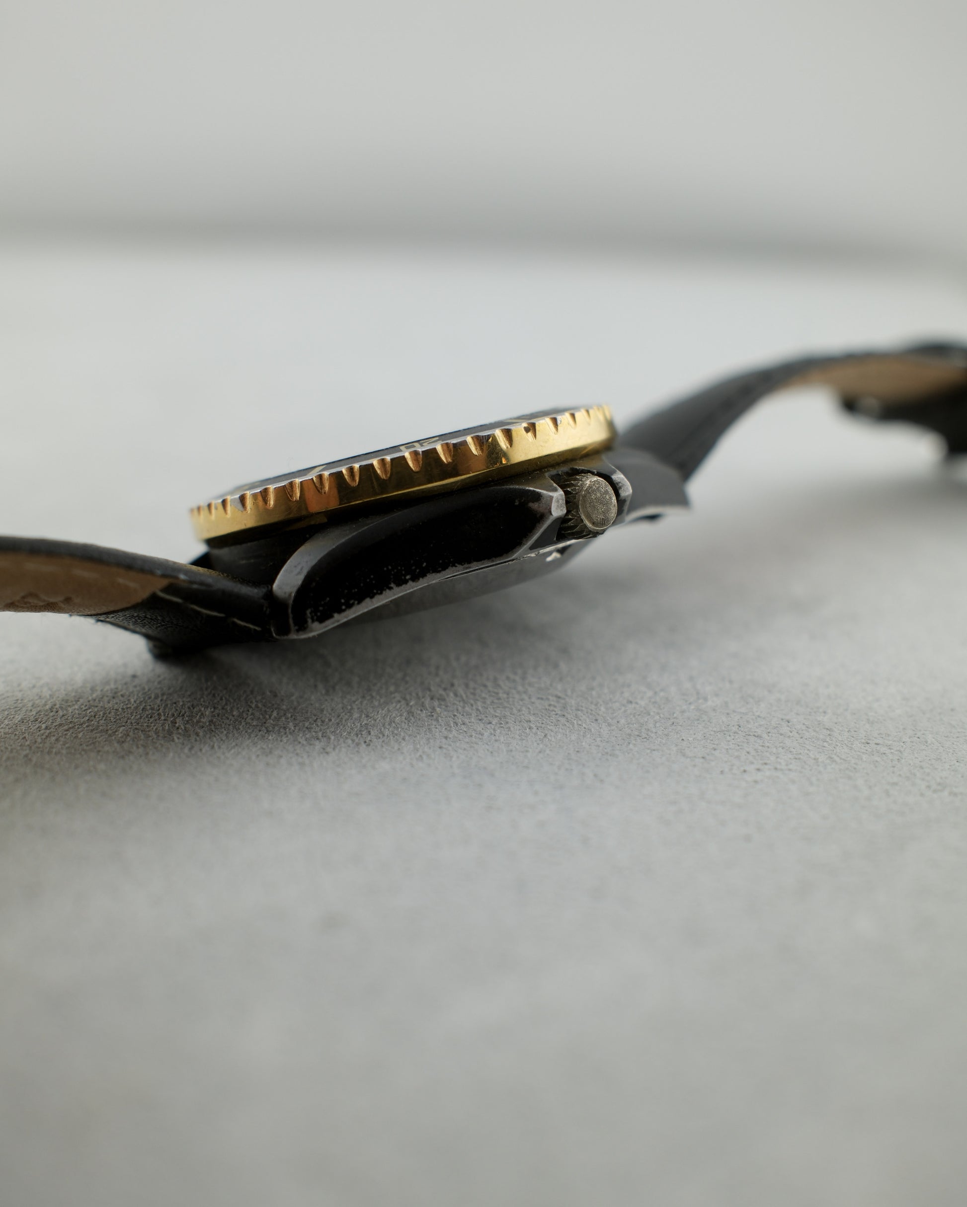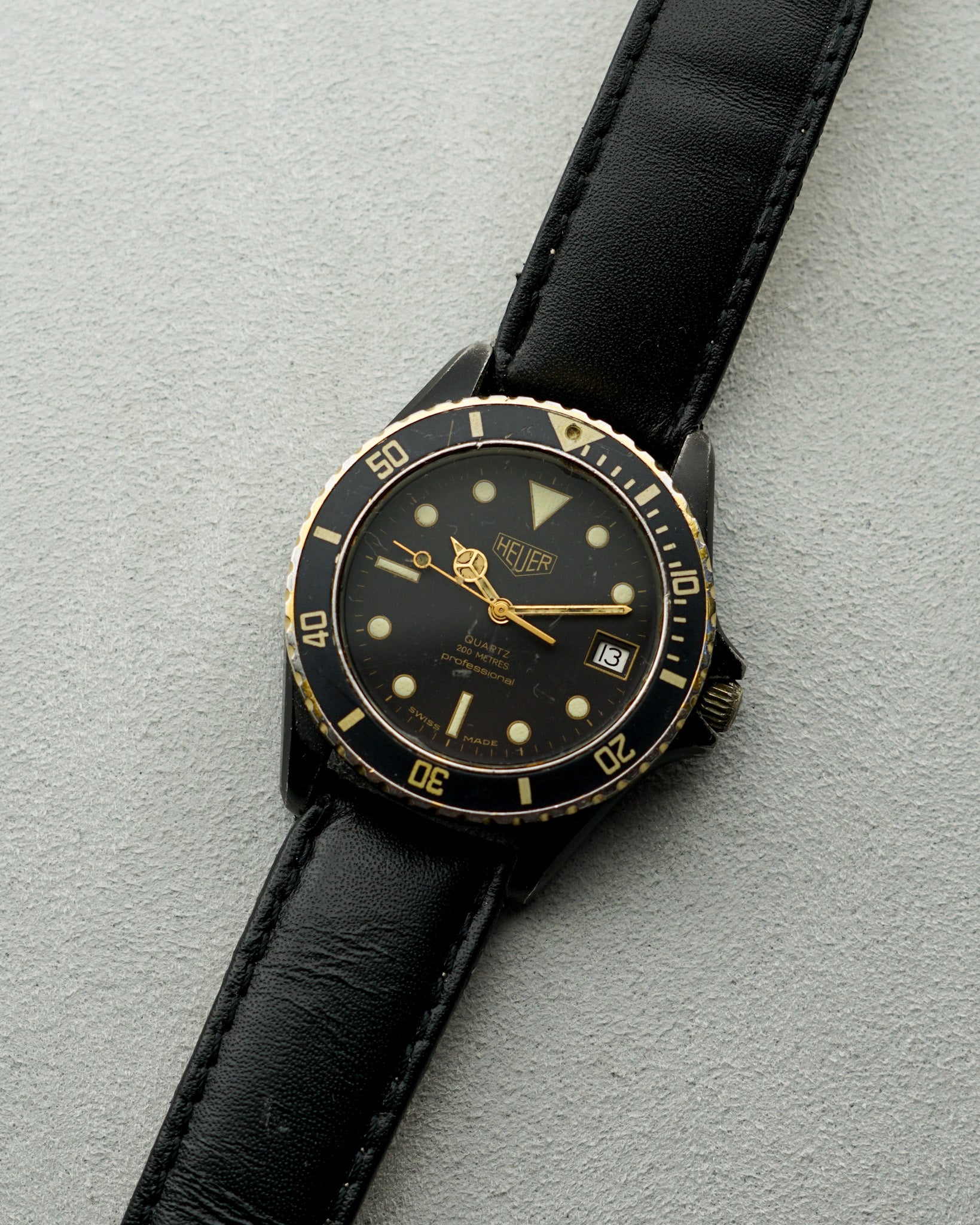 This Heuer Professional Diver Ref. 980.029 sports a 37mm black PVD-coated steel case with a striking black dial supported by gold accents. Powered by an A. Schild quartz movement, it features a date window for everyday practicality. This watch comes on a genuine leather strap and includes its original two-tone PVD-coated Heuer branded bracelet.