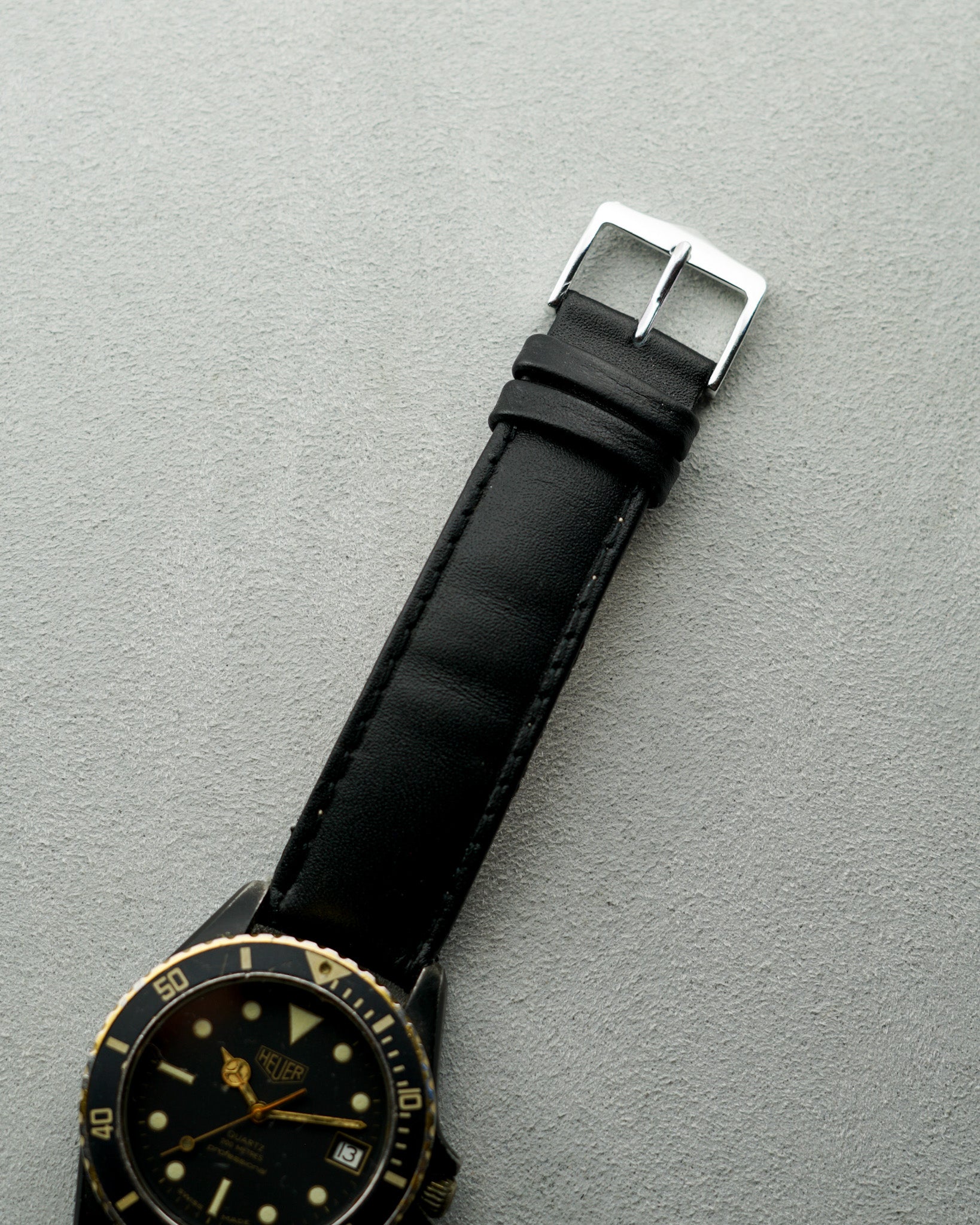 This Heuer features a 37mm black PVD coated steel case that sits in overall fair condition, with coating loss to the case sides, crown guards, and notably the rear of its lugs. The gold finish on its bezel also shows some material loss. Its steel case back displays “984.013,” a reference from a yellow gold-colored model, suggesting the case back was replaced at some point. Its clean black dial has lumed hour markers, a stick-style minute hand, a Mercedes hour hand, and a lollipop seconds hand. While its hands retain lume, they exhibit dark spots compared to the dial lume. Powered by an A. Schild quartz movement, it is fitted with a black leather strap and plain steel buckle. The watch also comes with its original black PVD coated bracelet, which shows noticeable coating loss and oxidation on the center links. Its crystal is in fair condition with visible scratches on the top surface. Overall, this Heuer presents fair vintage condition with clear signs of wear.