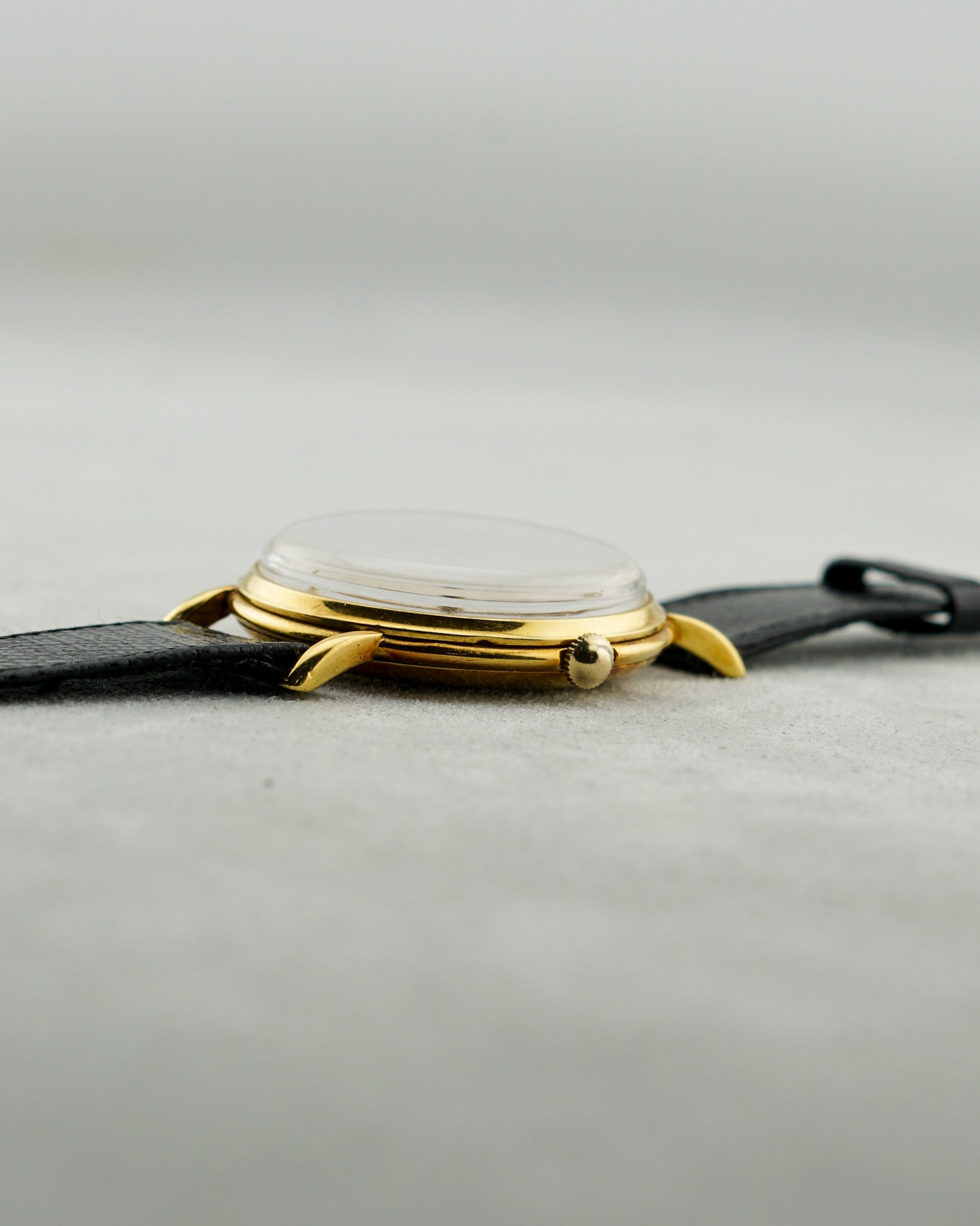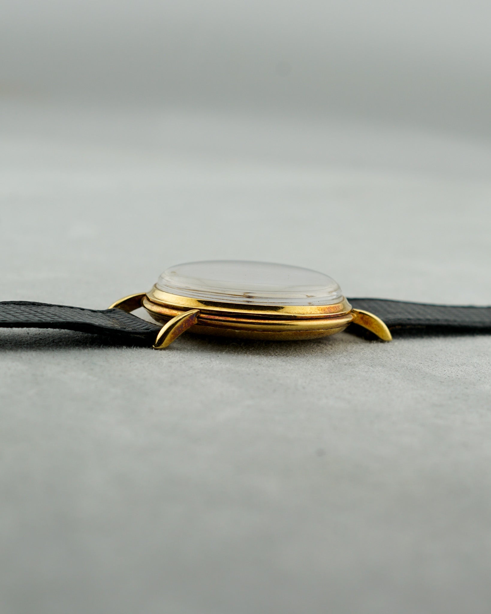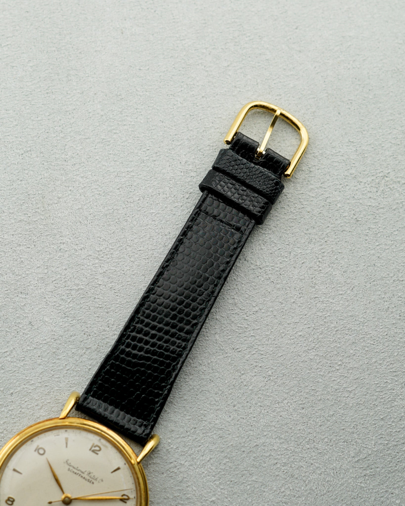 This IWC features a 36mm 18 karat yellow gold case that sits in overall fair condition. It shows light scratches to its surface and a noticeable oxidization adding a few spots of red/orange hues. Its white dial is clean with gold applied numerals and gold hands. Its dial does show to have been refinished at one point. It's crown looks to be a replacement part to the watch. This piece is powered by the well regarded 17-jeweled Caliber 89 movement and is fitted with an aftermarket black leather strap and generic gold buckle. Its domed crystal sits in good condition with some light scratches to its surface. Overall, this IWC sits in fair vintage condition, showing wear consistent with its age and refinishing work along the way.