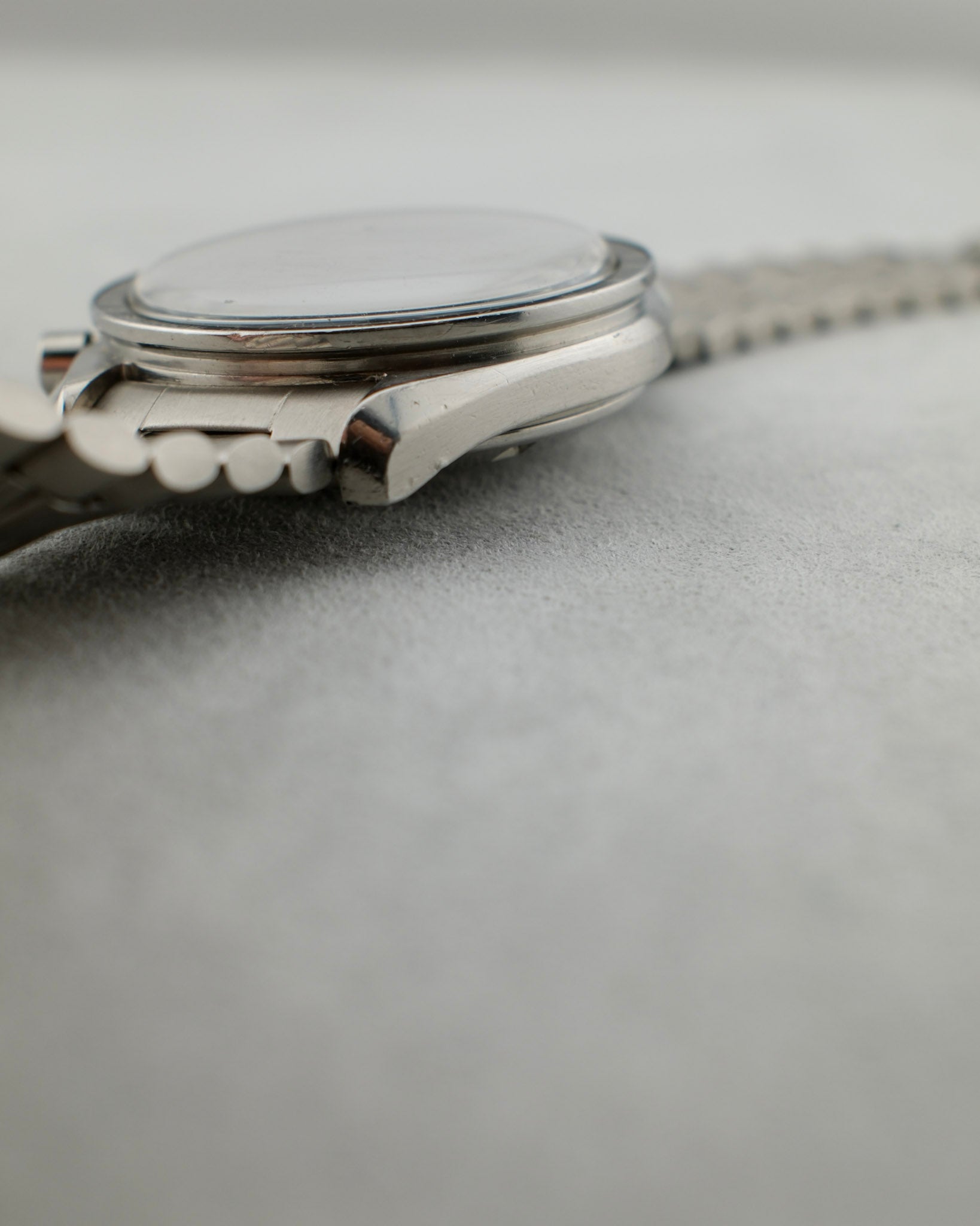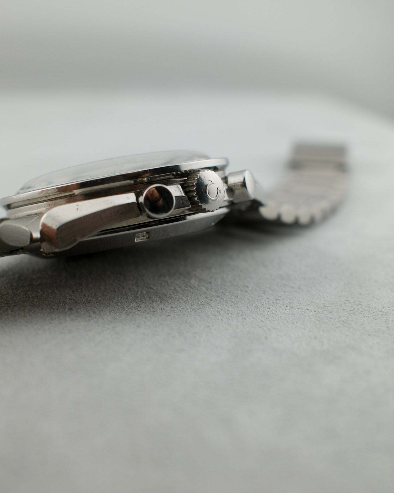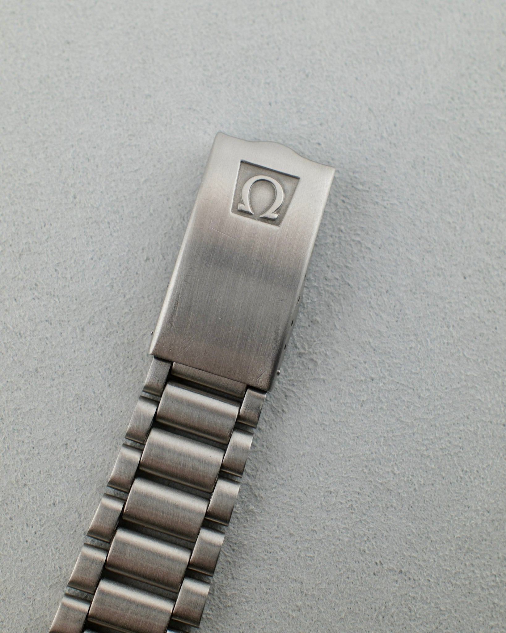 This Omega Speedmaster features a 42mm stainless steel case that sits in overall good condition and likely received a polish at one point. It shows light scratches and dings throughout. Its bezel showcases the most obvious wear with a scratch to the word “tachymeter”. Its black dial is clean and its greenish lumed indices remains active. It sports lumed stick hands and white lumed central chronograph seconds hand. This piece is powered by an 17-jeweled Omega caliber 861 movement and is fitted with a stainless steel bracelet and Omega logo on its buckle. Its crystal sits in good condition. Overall, this Omega sits in good vintage condition, showing wear consistent with its age.