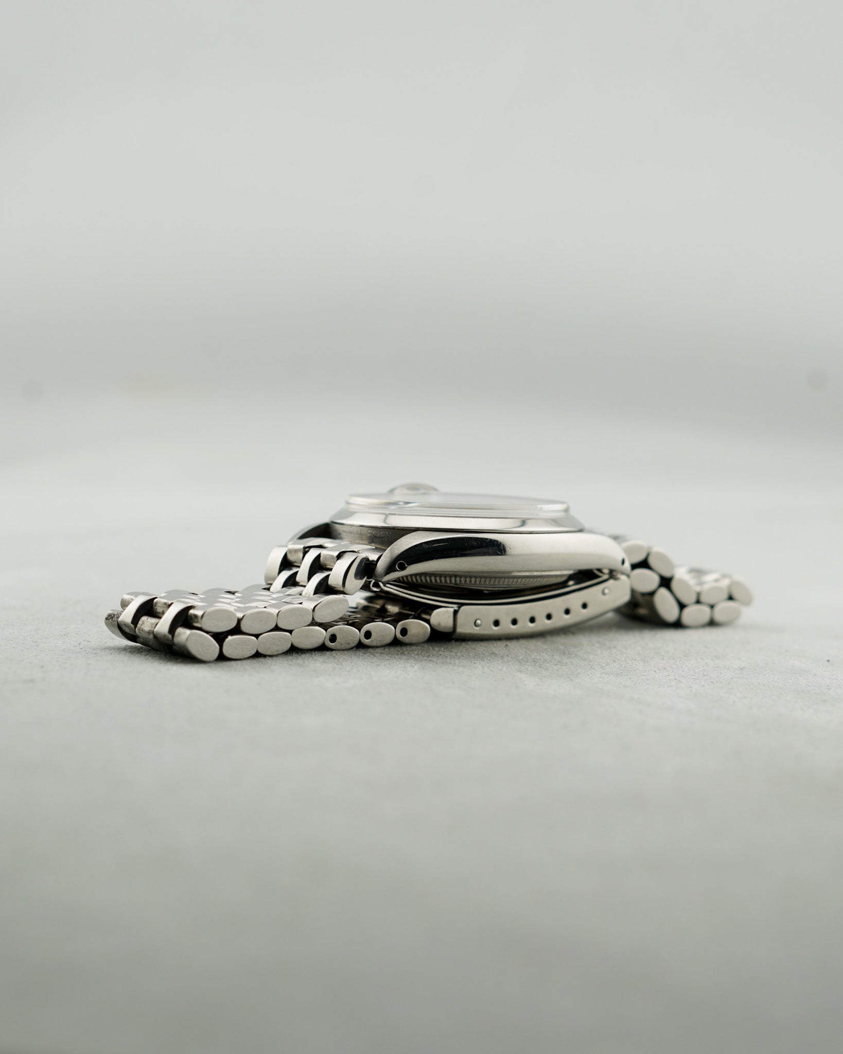 This Rolex features a 34mm steel case that sits in overall good condition with evidence of polishing to its surfaces, most notably to its case back. It showcases some small expected dings for its age and marks to the rears of its lugs. Its silver dial is clean, with applied hour markers, stick hands, and a date window at 3 o’clock. This piece is powered by a 26-jeweled automatic movement and is fitted with a steel J.B. Champion aftermarket bracelet that sits in fair condition with some stretch and scratches, most notably to its buckle. Its crystal with its cyclops window sits in good condition. Overall, this Rolex sits in good vintage condition, showing wear consistent with its age and some watchmaker upkeep over time.