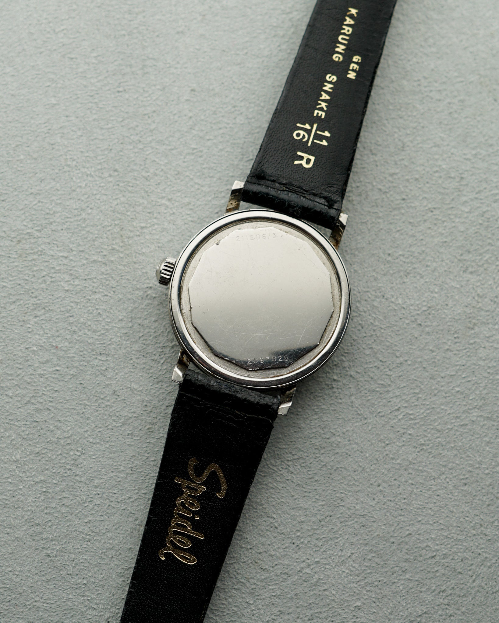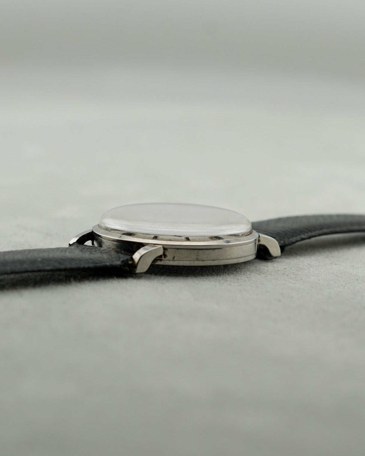 The Universal Genève Ref. 2112.06/3 from the late 1950s sports a comfortable 32mm steel case. Its silver dial wears a circular geometric pattern through the center of its dial and is paired with a steel buckle sporting a similar textured finish. Powered by the 17-jewel Caliber 1105 movement, this is a classic UG design made for straightforward daily wear.