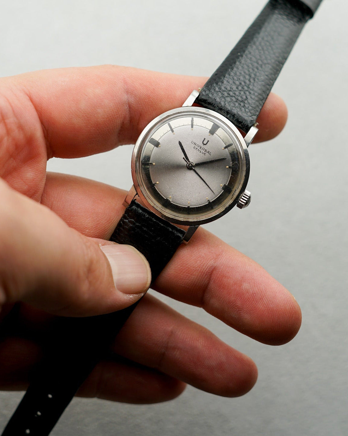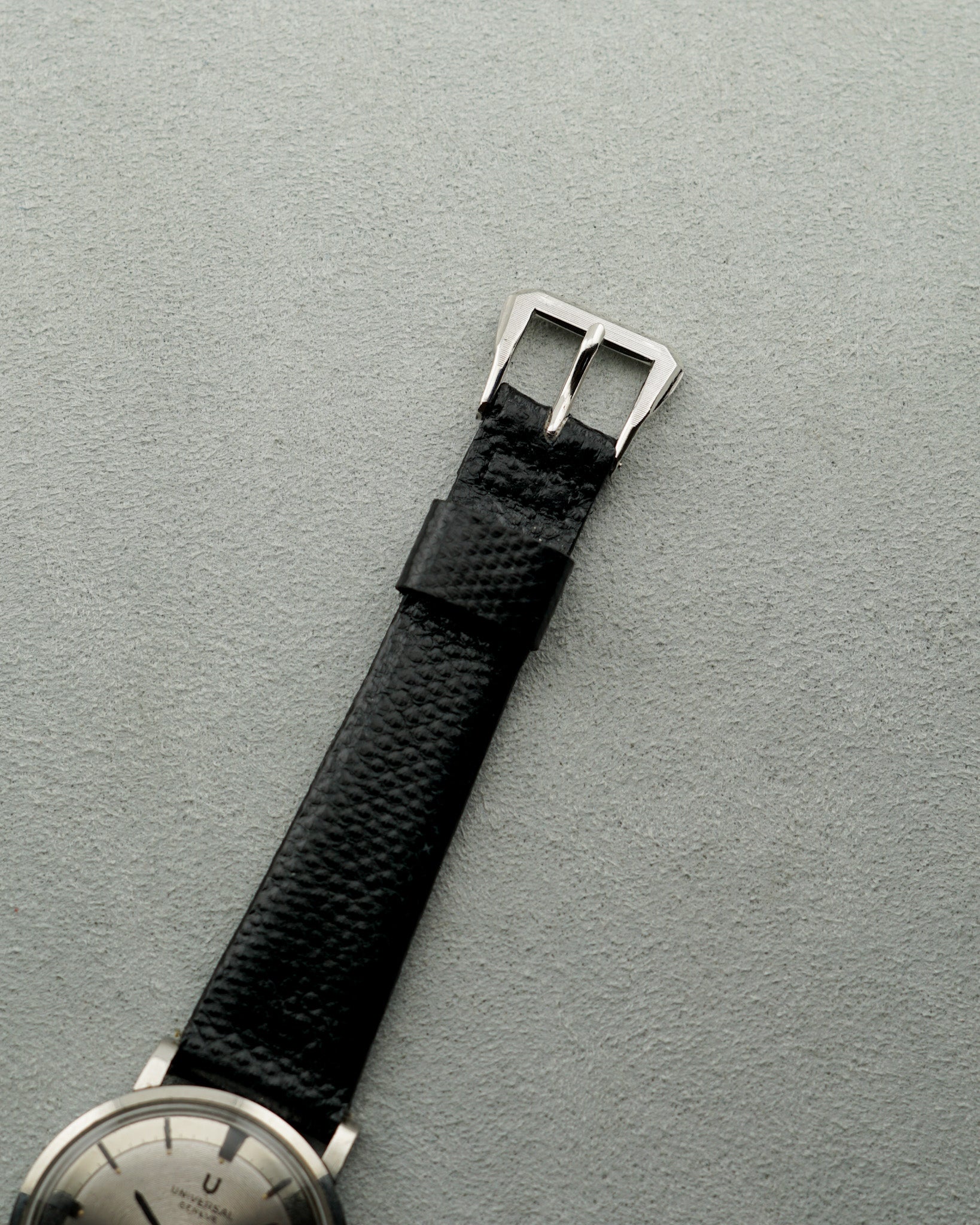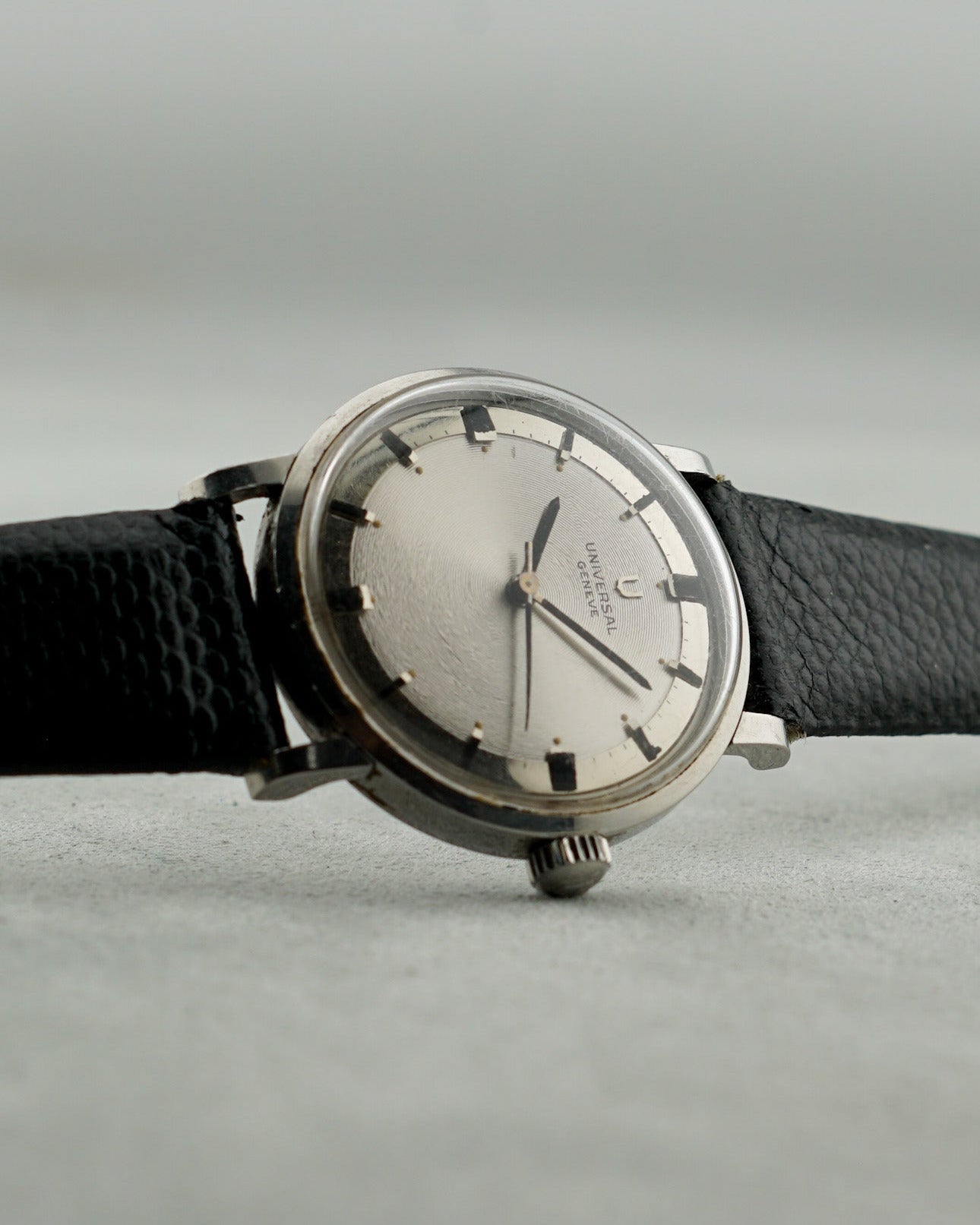 This Universal Genève features a 32mm steel case in overall good condition. It has visible scratches on the exterior, most notably on the screw-down case back where they are more pronounced. Its textured silver dial is clean with minor marks, including a tiny one beneath the center pinion and another just above the 9 o’clock indice. The watch sports applied indices with a black and silver finish matching the handset. It retains lume plots in front of each indice. The brand text and applied “U” logo remain intact, along with its “U” marked crown. This UG is powered by a 17-jewel manually wound movement and fitted with an aftermarket black karung snake leather strap and a steel textured buckle that matches the dial finish. Its crystal is in fair condition with visible scratches. Overall, this Universal Genève sits in good vintage condition, showing wear consistent with its age.